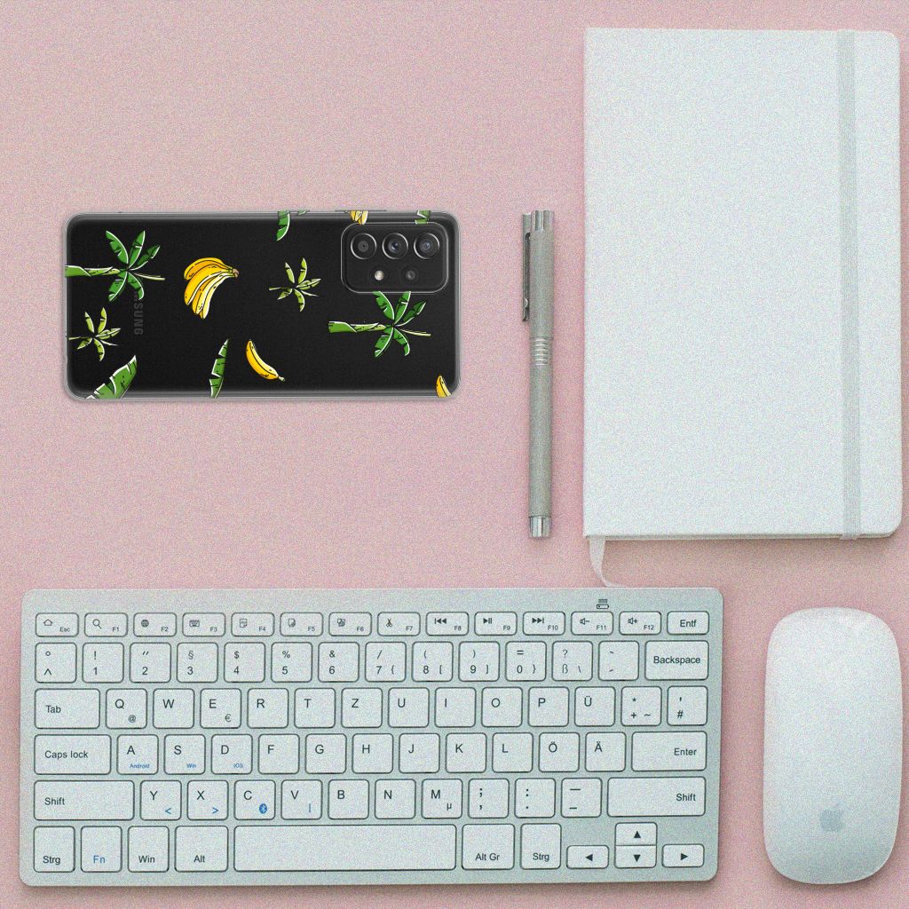 Heb jij al zin om op vakantie te gaan? Dat krijg je hoe dan ook als je één blik werpt op dit vrolijke hoesje voor je Samsung Galaxy A52 (5G/4G) met Banana Tree design. Het fleurige tafereel van bananenbomen, bananenbladeren en bananen doet je gedachten afdwalen naar paradijselijke bountystranden met azuurblauwe zee en helderwitte zandpartijen. Kortom: dit hoesje is goed voor je humeur. Naast het luchtige design zijn daar nog meer redenen voor, want dankzij de stevige materialen weet je zeker dat dit TPU Case je telefoon altijd optimaal beschermt Dit hoesje wordt alleen aan de bovenkant bedrukt en is zeer flexibel. De randen van het hoesje blijven transparant. Met dit hoesje breng je jezelf in zomerse sferen en gun je jezelf een krasvrije telefoon.