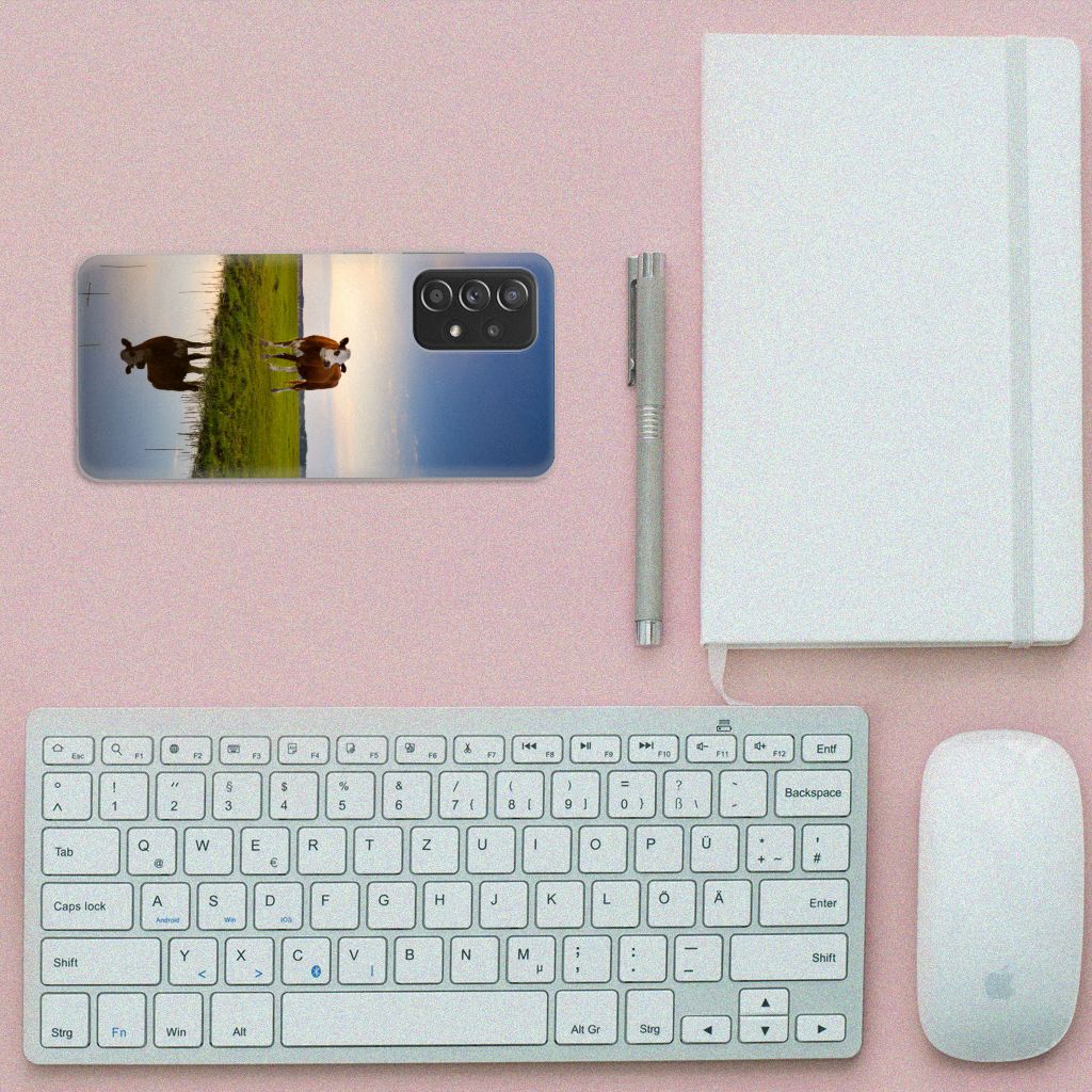 Het levert een idyllisch plaatje op, dit hoesje met een koe en ondergaande zon op de achtergrond. Door een koe buiten te laten lopen en grazen, hebben ze minder kans om ziek te worden. De Koe graast het liefst met soortgenoten, al zijn deze een stukje van de koe op de case verwijderd. Dit levert ook een mooi plaatje op, zoals je kunt zien op dit design hoesje. Dit tpu hoesje met koeien ziet er flexibel uit en is voorzien van alle uitsparingen. Een Samsung Galaxy A52 (5G/4G) TPU Hoesje met koeien beschermt jouw smartphone vooral aan de achterkant en zijkanten. De zijkanten blijven transparant, de rest van het hoesje is bedrukt. Koeien herkauwen het liefst liggend, behalve wanneer het regent. Zo goed als grazen voelt voor koeien, zo duurzaam zal jouw smartphone blijven met dit design hoesje. Het TPU is schokabsorberend en niet te breken. De TPU case past altijd in je broekzak.