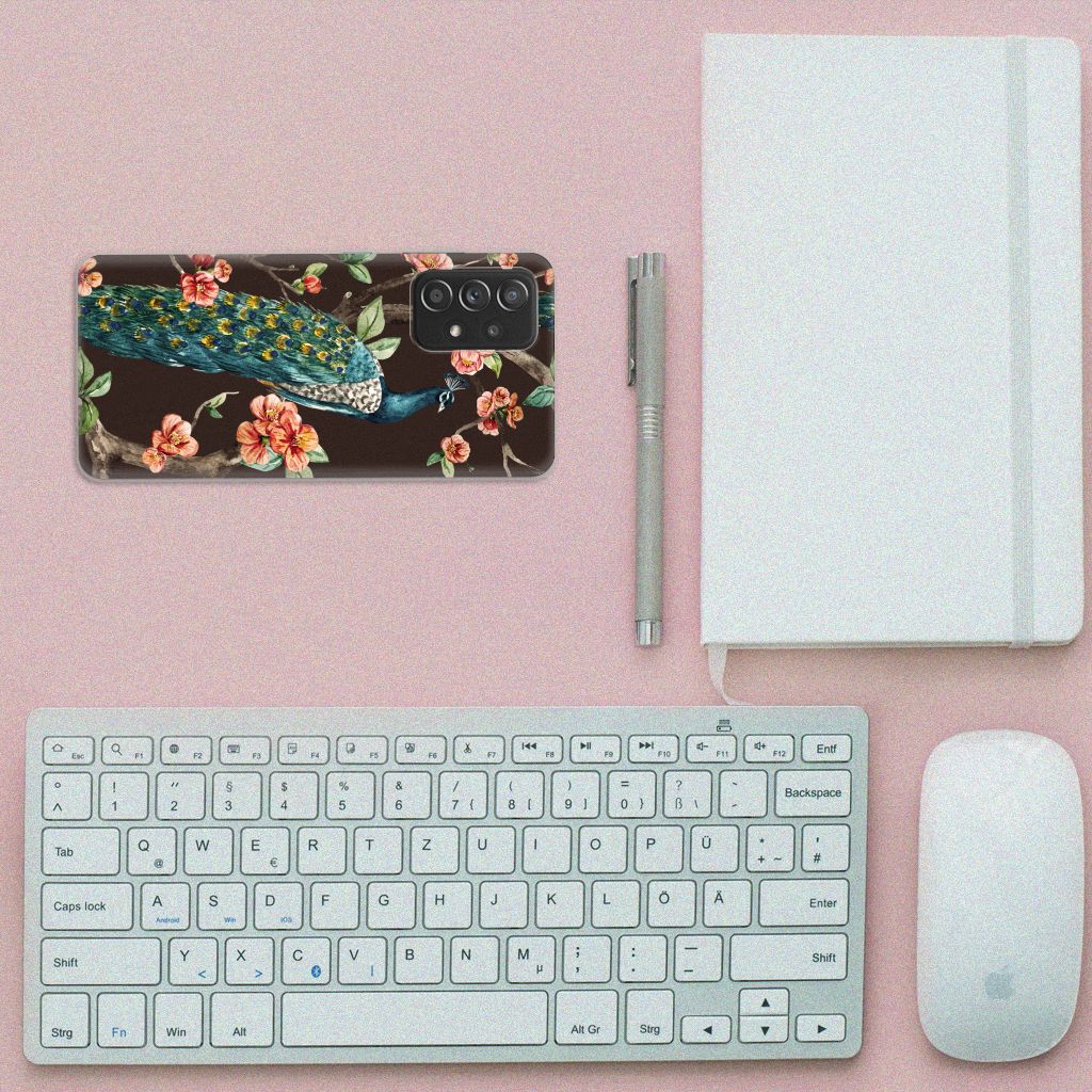 Op deze Samsung Galaxy A52 (5G/4G) TPU Hoesje kun jij zo trots als een pauw zijn. Met dit geweldige design hoesje met een Pauw met Bloemen erop kun jij je smartphone voor zeer lange tijd beschermen. Deze tpu case is zeer duurzaam en gemaakt van zeer elastisch materiaal. Je bent zeer flexibel met deze TPU case met print van een pauw. Met een tpu case met fleurige bloemen en trotse pauwen wordt jouw telefoon er een stuk mooier op. De onderscheidende case heeft opstaande randen aan de voorzijde en wordt alleen aan de bovenzijde bedrukt. Zie jij liever jouw eigen huisdier op een telefoonhoesje? Dan adviseren we je zelf een hoesje te ontwerpen met onze unieke Phone Case Designer.