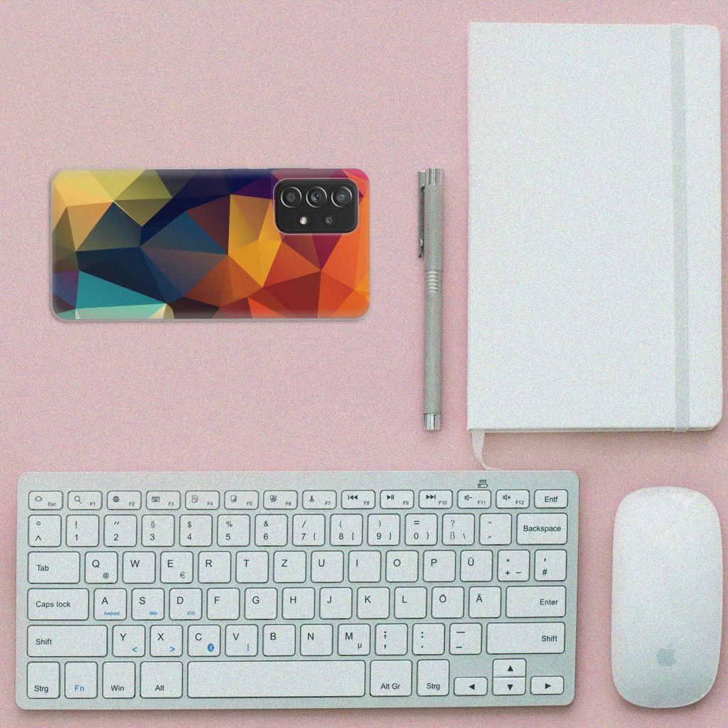 Veelkleurige driehoeken die samen eindeloze asymmetrische patronen lijken te vormen. Het is het abstracte schouwspel dat op dit fraaie hoesje voor je Samsung Galaxy A52 (5G/4G) direct de aandacht trekt noemen we voor het gemak trekt noemen we voor het gemak Polygon Color. De een ziet er een berglandschap in, de ander piramides. Wat zie jij erin? Zeker is in elk geval dat de aanblik van dit fascinerende ontwerp je niet snel gaat vervelen. Het kleurige spel van lijnen en vlakken blijft eindeloos boeien en geeft jouw TPU Hoesje een hippe en kunstzinnige uitstraling. De kracht die het lijnenspel uitstraalt, komt ook terug in het hoesje zelf. Dit hoesje wordt alleen aan de bovenkant bedrukt en is zeer flexibel. De randen van het hoesje blijven transparant. Wat wil je nog meer?