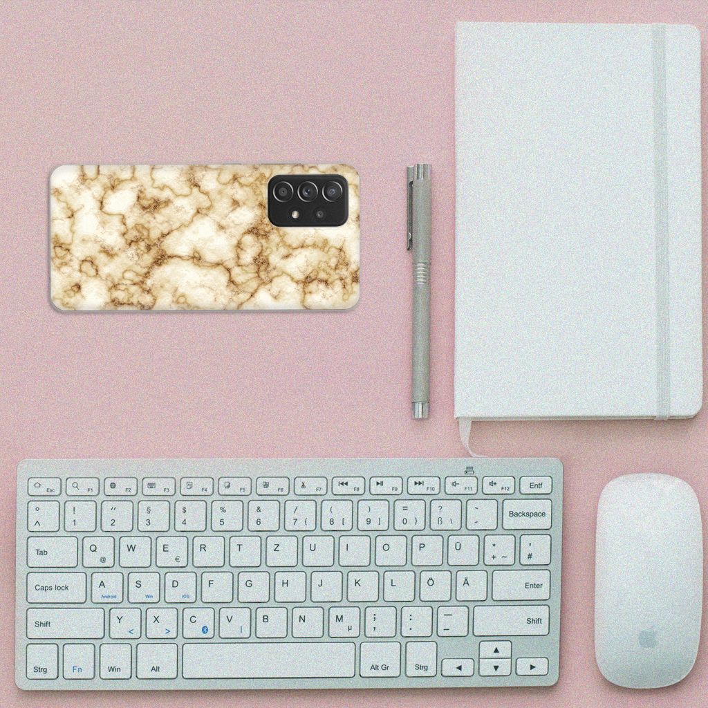 Deze Samsung Galaxy A52 (5G/4G) TPU Siliconen Hoesje met Marmer Goud is het waard om een blokje voor om te rijden. Dit is overigens niet nodig. Als je het hoesje met goud marmer nu bestelt heb je het zeer snel in huis. Je kunt er bij wijze van spreken thuis op gaan zitten wachten. Je hebt diverse soorten marmer. We hebben enkele fraaie kleuren op onze hoesjes gezet, zoals in dit geval het gouden marmer. Het goud marmer wordt bedrukt op de achterkant van de tpu case, die beschikt over alle nodige uitsparingen waardoor je alle knoppen en poorten van je smartphone kunt bedienen. Verder is de case met goud marmer gemaakt van zeer flexibel materiaal. De rijkheid aan kleuren en varianties in afwerking is een schitterende eigenschap van marmer. Dit tpu hoesje met goud marmer heeft ook veel schitterende eigenschappen en is de ideale bescherming voor jouw smartphone.