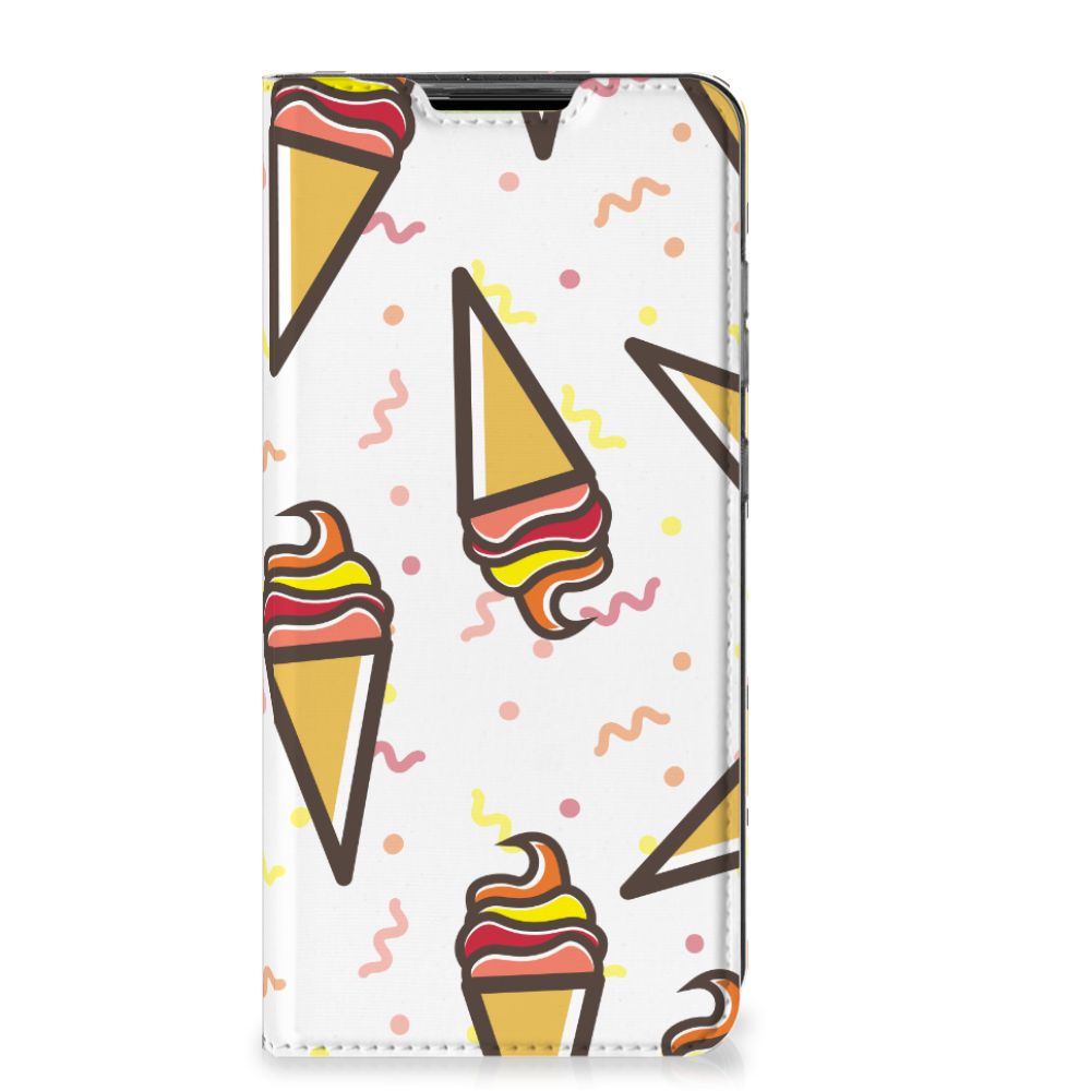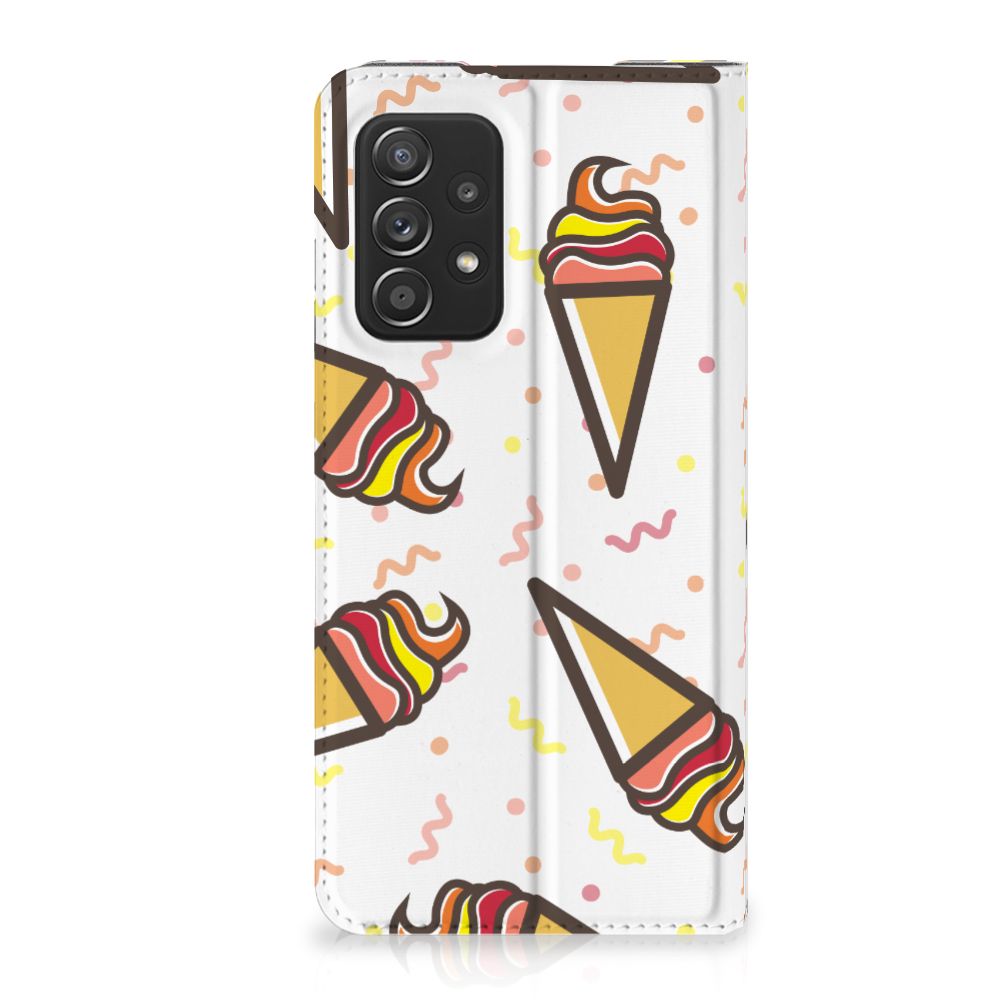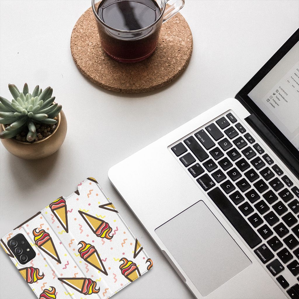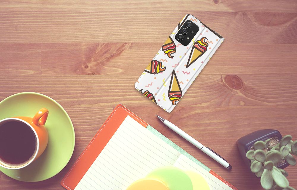 Een vrolijke Samsung Galaxy A52 Flip Style Cover met daarop verschillende ijsjes. Als je daar geen zomers gevoel meer van krijgt, weten wij het ook niet meer. De zomer en ijsjes zijn onlosmakelijk met elkaar verbonden. Tijdens een bezoekje aan het strand mag een lekker ijsje bijvoorbeeld niet ontbreken. Een design hoesje met lekkere Icecream print past daar natuurlijk ook ontzettend goed bij. Jouw telefoon is helemaal beschermd met een stand case met ijsjes design. De aankoop van deze case is een heerlijke investering, die zich gegarandeerd terugbetaalt. Alle zijden van dit hoesje worden bedrukt met ijsjes. De case heeft een speciale standaard en de houder aan de binnenzijde is van TPU. Onder alle weersomstandigheden zal deze case met opbergvakje perfect functioneren, ook in de zomer met een ijsje in je hand. Dit smaakvolle hoesje is zeer goedkoop te bestellen en wordt zeer snel bezorgd.