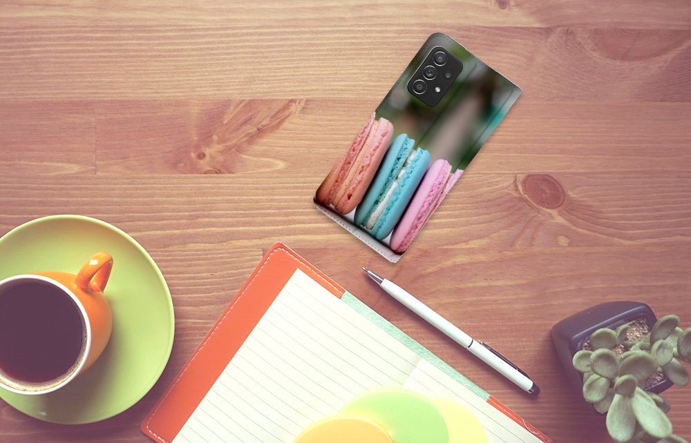 Dit stand hoesje met macarons is een zeer opvallende bescherming voor jouw smartphone. Macarons zijn Franse koekjes: kleine, rond en luchtig. Ze zijn aan elkaar geplakt met een zachte vulling. Ze worden in veel verschillende smaken gemaakt, herkenbaar aan de verschillende kleuren zoals chocolade (donkerbruin), mokka (middenbruin), kersen (rood), pistache (groen), aardbei (roze), framboos (karmijn), citroen (geel) en kokos (roomwit). Deze kleuren kun je natuurlijk ook zien op dit fraaie design hoesje met macarons. Heb je altijd al een Samsung Galaxy A52 Flip Style Cover willen hebben met macarons? Grijp dan nu je kans. Deze case heeft zeer veel goede eigenschappen, zoals 1 opbergvakje en een magnetische sluiting aan de binnenkant. Dit design hoesje met macarons wordt aan alle zijden bedrukt. De houder aan de binnenkant van het hoesje is van TPU. De case heeft ook een handige standaard.