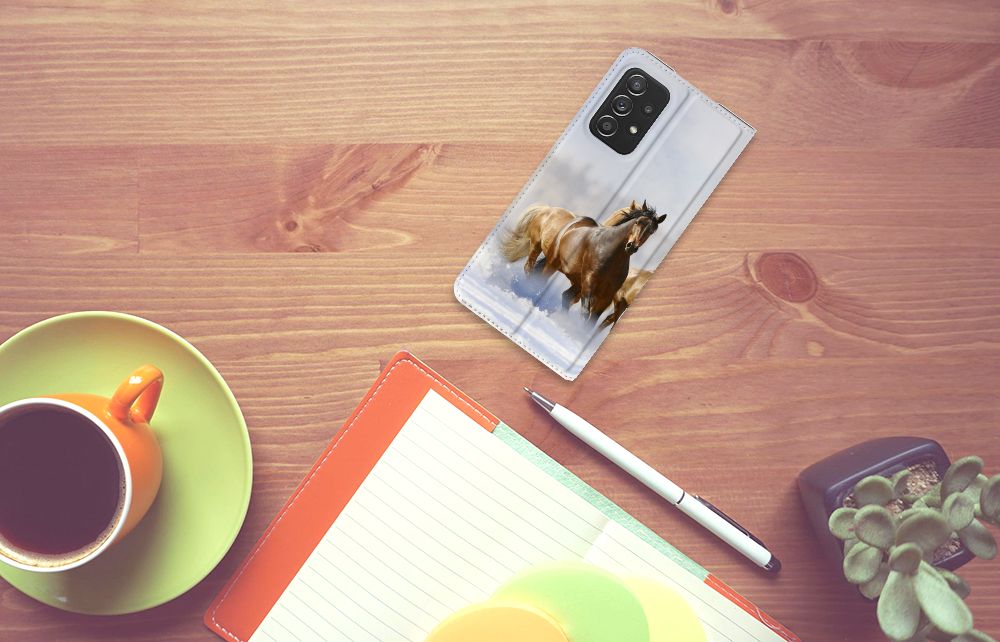 Voor de paardenliefhebbers onder ons hebben we onze collectie uitgebreid met dit design hoesje met print van paarden. Vroeger hield de mens vooral werkpaarden, inmiddels hebben we vriendschap gesloten met het paard. Vandaar dat het ook een favoriet dier is op onze smartphonehoesjes, zoals deze stand cases. Deze Samsung Galaxy A52 Hoesje maken met Paarden is niet alleen super mooi en chique, het sluit ook nog perfect dankzij de magneet aan de binnenzijde. Verder heeft de case een TPU houder aan de binnenzijde en een houder voor een pasje. Zie je liever je eigen paard terug op een hoesje? Dat kan! Door zelf een uniek hoesje te ontwerpen, met eigen foto’s en teksten. De stand case met paarden wordt aan alle zijden bedrukt.