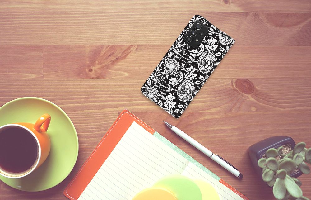 Bloemen raken nooit uit de mode! Een mooie bloemenprint op je telefoonhoesje dus ook niet. Dit ontwerp met mooie, enigszins abstracte bloemen is perfect voor de liefhebber van bloemen die geen felgekleurd hoesje wil. Vanwege de zwarte achtergrond en de witte bloemen heb je toch een opvallend en uniek design in handen. Dit black flowers-ontwerp staat op een Smart Cover voor je Samsung Galaxy A52. Dit populaire smartphonehoesje met het beton-design heeft één vakje voor een pasje of briefgeld en is aan alle zijden bedrukt. Met de standcase zet je je telefoon gemakkelijk neer, zodat je je handen vrij hebt als je bijvoorbeeld een video wilt kijken. De binnenkant van de standcase is van grijs PU-leer. Dat is fijn, omdat je daardoor niet snel vlekken ziet op je hoesje.