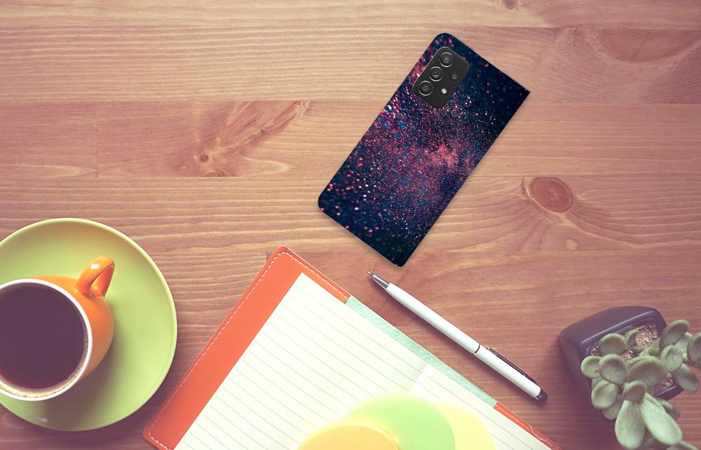 Je waant je in de zevende hemel met dit kunstzinnige, glitterachtige design hoesje met paarse en blauwe kleuren tegen een inktzwarte achtergrond. Het smartphone hoesje heeft ook een wat science fiction achtige allure. Met deze design Stars case zul je zeker opvallen. Als dit je bedoeling is, bestel dat snel dit waanzinnig mooie product voor je Samsung Galaxy A52. Het telefoonhoesje is van alle gemakken voorzien en combineert een hele fraaie uitstraling met maximaal comfort. Bovendien is het gemaakt van zeer stevig en flexibel materiaal. Het unieke design, door B2C Telecom ontworpen, staat op een Stand Case. Deze case beschermt jouw telefoon aan alle kanten en beschikt over een 1 opbergvakje en een speciale standaard. Het hoesje wordt afgesloten met een magneet aan de binnenzijde. De houder aan de binnenzijde is van TPU.