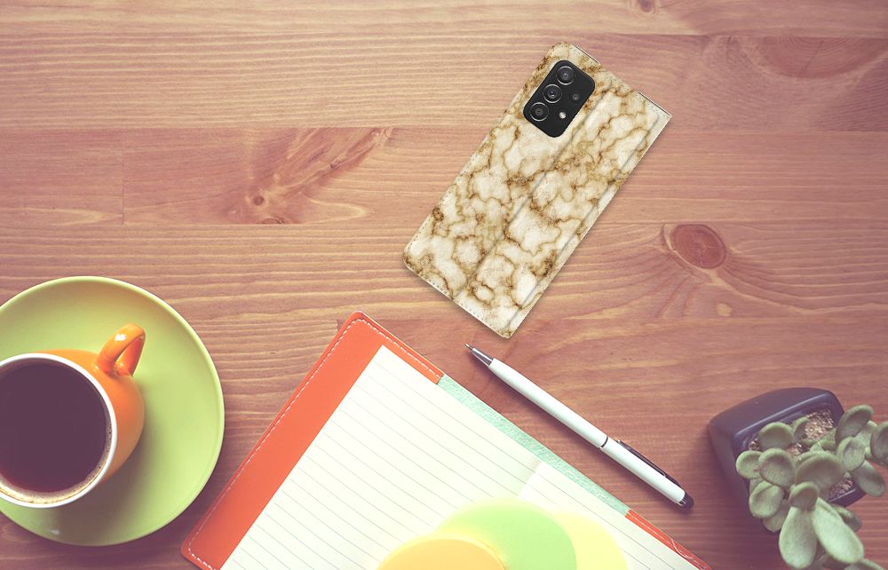 Deze Samsung Galaxy A52 Standcase met Marmer Goud is het waard om een blokje voor om te rijden. Dit is overigens niet nodig. Als je het hoesje met goud marmer nu bestelt heb je het zeer snel in huis. Je kunt er bij wijze van spreken thuis op gaan zitten wachten. Je hebt diverse soorten marmer. We hebben enkele fraaie kleuren op onze hoesjes gezet, zoals in dit geval het gouden marmer. Het gouden marmer wordt bedrukt op alle zijden van de stand case, die beschikt over een vakje voor pasjes of briefgeld en een magnetische sluiting aan de binnenzijde. Verder heeft de case met goud marmer een houder van TPU. De rijkheid aan kleuren en variaties in afwerking is een schitterende eigenschap van marmer. Dit stand hoesje met goud marmer heeft ook veel schitterende eigenschappen en is de ideale bescherming voor jouw smartphone.