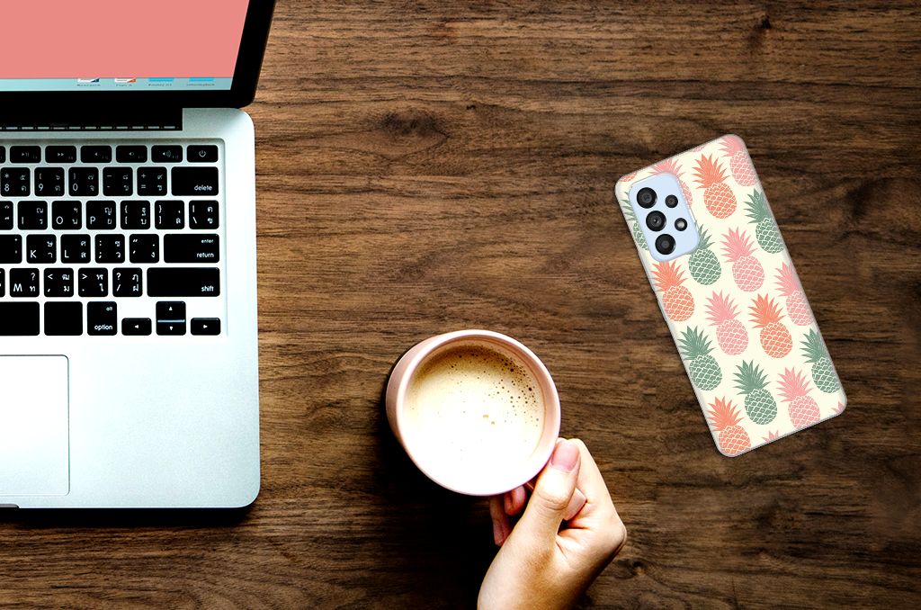 Ananas is een woord uit het Tupi, de taal van de Tupi-indianen, en betekent uitmuntende vrucht. Dit fruit van zeer hoge kwaliteit staat op onze superieure boekhoesjes, stand cases, hard cases en TPU cases. Jij blijft er gezond uitzien als je zo nu en dan een hap neemt van een Ananas , jouw smartphone blijft tip top in orde als je er een leuk telefoonhoesje omheen doet. Een ananas heeft stevig, veerkrachtig vruchtvlees. Een beetje te vergelijken met het TPU in onze hoesjes. TPU is elastisch materiaal, dat zeer buigzaam is. Vandaar dat het zeer schokbestendig is. Het ananas design staat op een staat op een TPU case. Deze Samsung Galaxy A53 5G Siliconen Case wordt alleen aan de bovenkant bedrukt en is zeer flexibel. De randen van het hoesje blijven transparant.