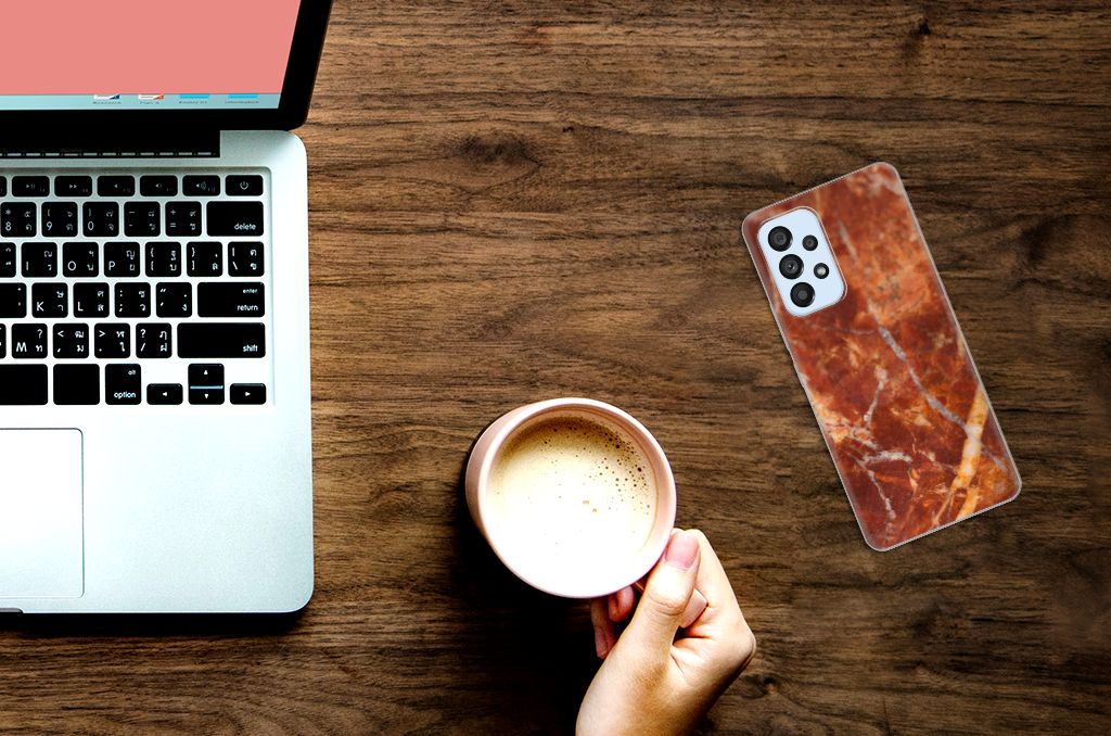 Dit design hoesje met Marmer Bruin is voor de artistieke personen onder ons. De Grieken en Romeinen wisten het al te waarderen door het als bouw- en bekledingsmateriaal toe te passen. Naast het witte Carrara marmer met haar zacht grijze geaderde belijning zijn de diverse soorten in een ruim kleurenpallet te krijgen. We hebben verschillende kleuren op design hoesjes gezet, zoals in dit geval bruin marmer. Dit is een Samsung Galaxy A53 5G TPU Siliconen Hoesje met marmer in bruine kleur. Het marmer wordt bedrukt op de voorkant van een tpu case, die beschikt over opstaande randen aan de voorkant en heel goed combineert met een screenprotector. De rijkheid aan kleuren en varianties in afwerking geeft ontwerpers de vrijheid om met marmer hele mooie architectonische projecten te realiseren. Wij hebben onze designer ook veel vrijheid gegeven. Het resultaat zie je terug in deze tpu case met bruin marmer, die jouw smartphone goed beschermt. De zijkanten van de case worden niet bedrukt met marmer.