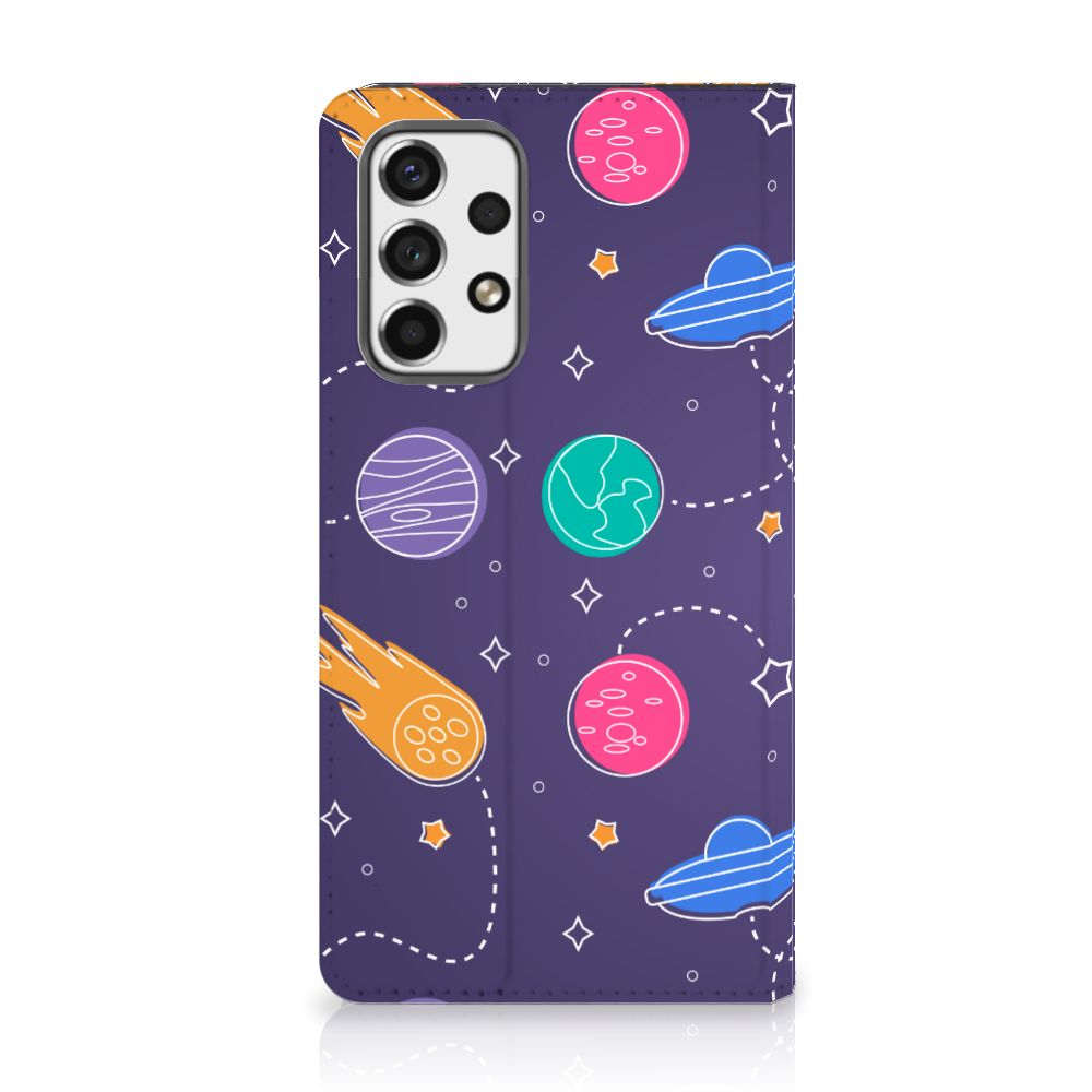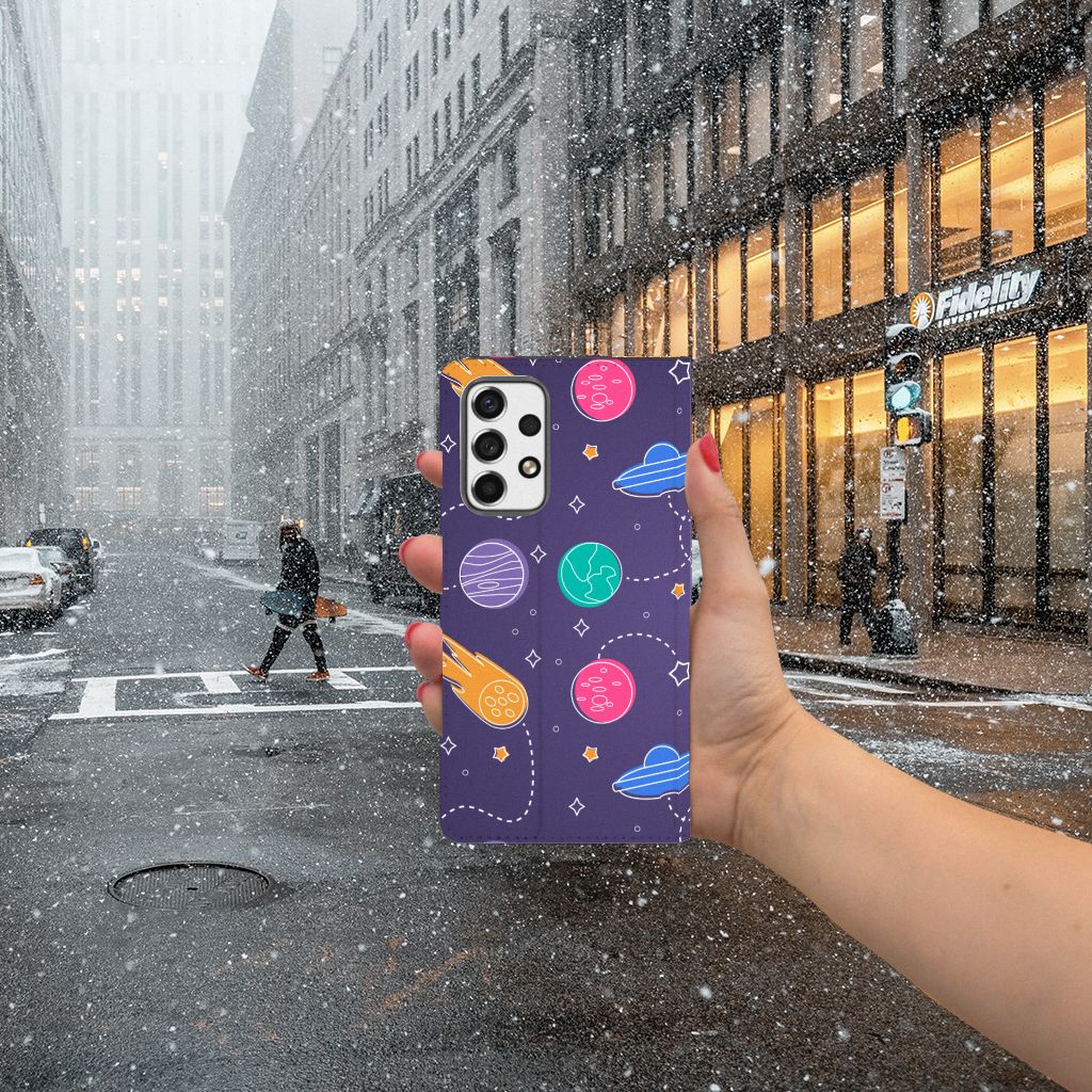 Ben je een beetje geïnteresseerd in buitenaards leven? Dan kan je wel eens enthousiast raken van deze Samsung Galaxy A53 Hippe Standcase met Space print. Dus mensen die van science fiction houden zullen deze case ongetwijfeld mooi vinden. Er zijn verschillende planeten en vliegende schotels te ontdekken in dit design hoesje. Dit kunstwerkje is voor heel weinig geld te bestellen op onze website. Je krijgt er maximale bescherming van je smartphone voor terug. De stand case beschermt jouw telefoon aan alle kanten en beschikt over een 1 opbergvakje en een speciale standaard. Het hoesje wordt afgesloten met een magneet aan de binnenzijde. De houder aan de binnenzijde is van TPU. Je zult ontdekken dat dit hele stevige telefoonhoesje een heel goede bescherming biedt tegen alle vormen van schade. Met dit hoesje hoef je niet bang te zijn dat er krassen op je design komen of scheuren in je scherm.
