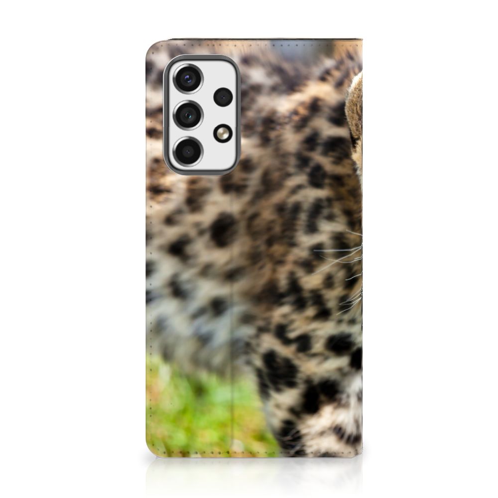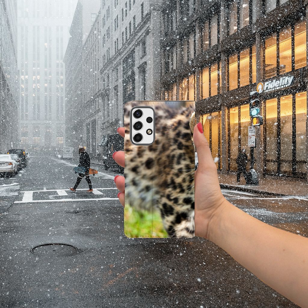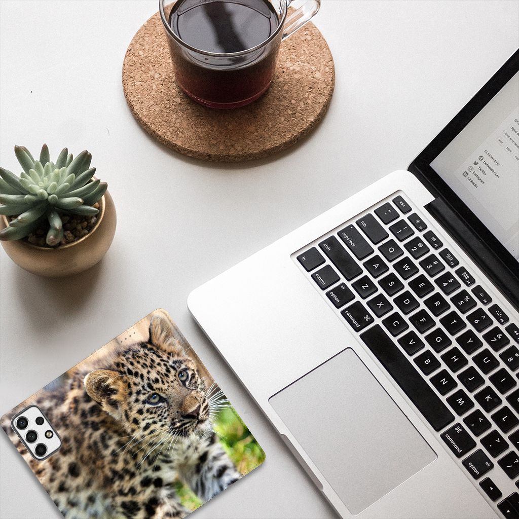 De luipaard is een grote, gespierde katachtige met korte, krachtige poten en een lange staart. Aangezien het op dit hoesje een baby luipaard betreft, zijn deze eigenschappen nog niet volledig tot wasdom gekomen. De kop van de luipaard is breed en een beetje rond van vorm met kleine, ronde oren. De snuit is middelgroot, met krachtige kaken en lange snorharen. De vacht van een luipaard is bedekt met veel zwarte vlekken. Kies je voor dit design hoesje, dan zal er van vlekken op jouw smartphone nooit en te nimmer sprake zijn. Het stoere en tegelijkertijd aandoenlijke design staat op een stand case. Een Samsung Galaxy A53 Hoesje maken beschermt jouw telefoon aan alle kanten en beschikt over een 1 opbergvakje en een speciale standaard. Het hoesje wordt afgesloten met een magneet aan de binnenzijde. De houder aan de binnenzijde is van TPU.