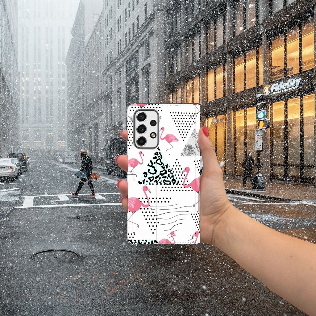 Een Samsung Galaxy A53 Hoesje maken met Flamingo Triangle is in vele opzichten bijzonder. De rode flamingo op het hoesje komt oorspronkelijk uit het Caraïbische gebied. Stel dat je in deze regio vakantie viert, dan val je zonder meer op met dit hoesje met flamingo’s en driehoeken. Deze stand case biedt bescherming voor alle zijden van je telefoon. Jouw smartphone ligt goed opgeborgen in de TPU houder aan de binnenzijde en in dit gedeelte van het hoesje met flamingo’s en driehoeken zit de magnetische sluiting. Ook de palmbomen op deze stand case bieden het ultieme vakantiegevoel. De stand case met flamingo’s en driehoeken heeft vakjes voor pasjes en is op maat gemaakt.