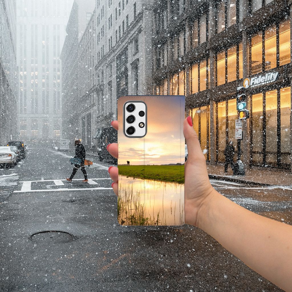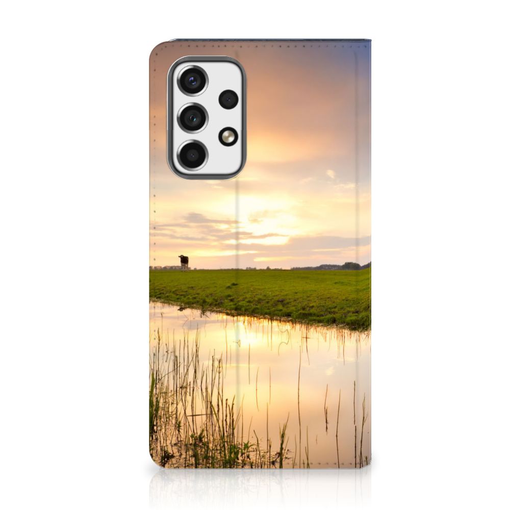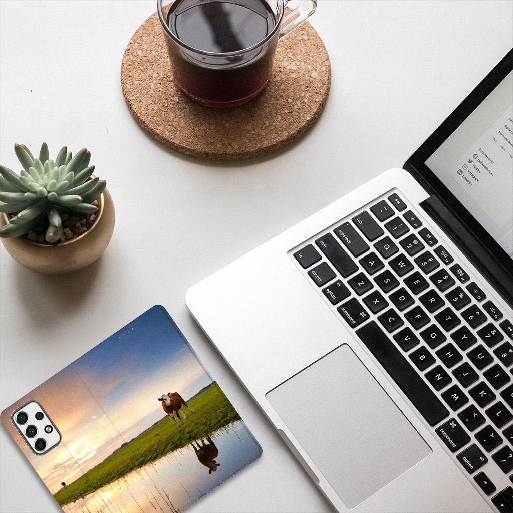 Het levert een idyllisch plaatje op, dit hoesje met een koe en ondergaande zon op de achtergrond. Door een koe buiten te laten lopen en grazen, hebben ze minder kans om ziek te worden. De Koe graast het liefst met soortgenoten, al zijn deze een stukje van de koe op de case verwijderd. Dit levert ook een mooi plaatje op, zoals je kunt zien op dit design hoesje. Deze stand case ziet er strak uit en is voorzien van verschillende uitsparingen. Een Samsung Galaxy A53 Hoesje maken met magneet aan de binnenzijde beschermt jouw smartphone overal. Alle zijden zijn bedrukt. Koeien hebben lange graasperioden nodig, afgewisseld door rust- en herkauwperioden. Zo goed als grazen voelt voor koeien, zo lang zal jouw design hoesje meegaan. De binnenkant van de stand case is van TPU, de buitenzijde van leer.