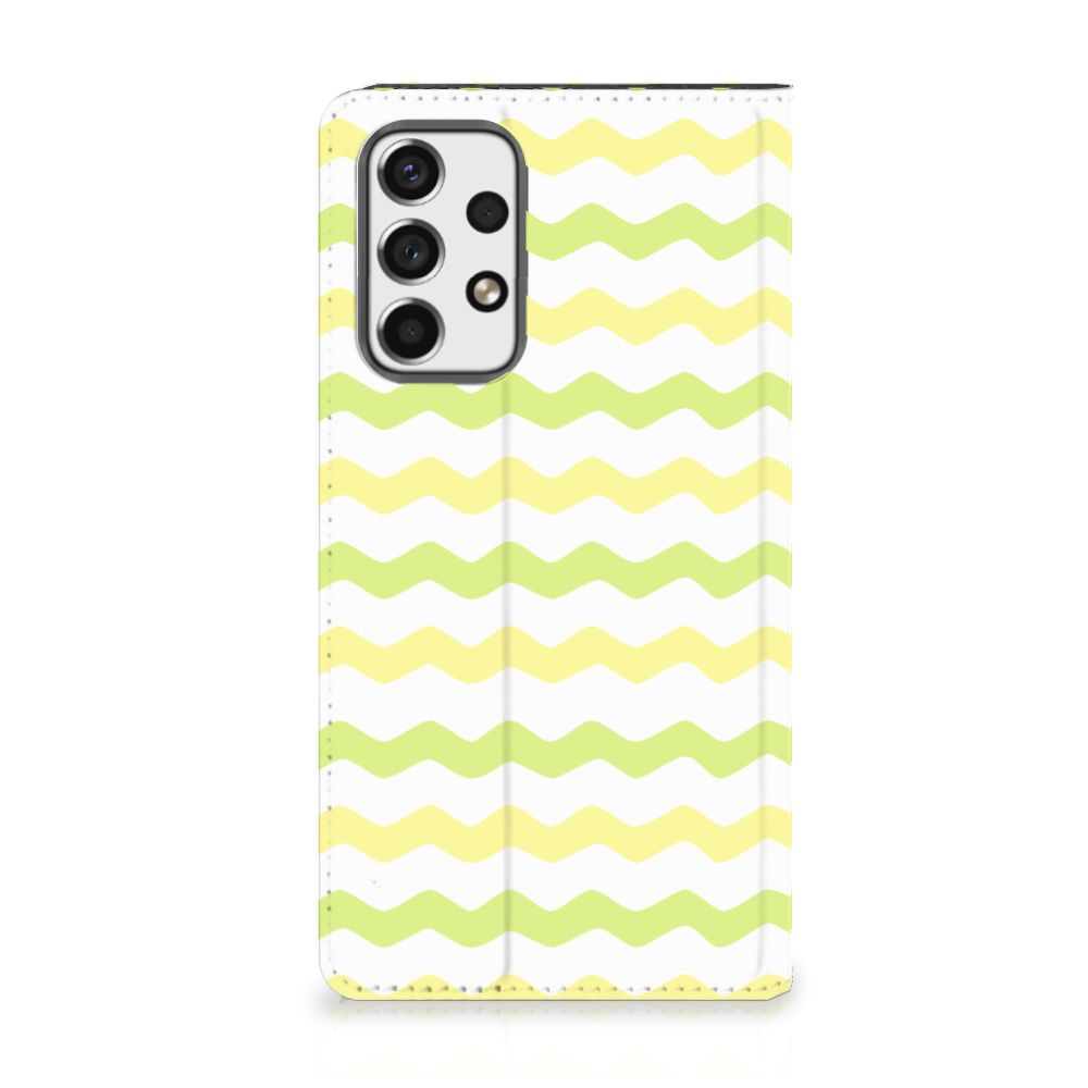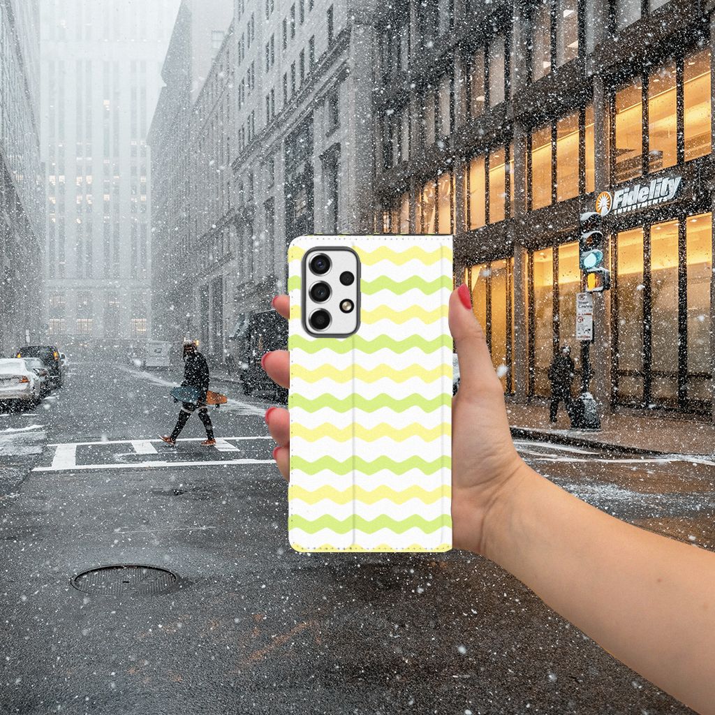 Dit Waves Yellow design hoesje met licht groene en gele golven is speciaal ontworpen voor jouw telefoon. We hebben een vleugje lichtgeel toegevoegd, zodat de case er een beetje spannender en leuker uitziet. Dit licht groene hoesje met licht groene golven ziet er oogstrelend uit. Het wordt in ons eigen magazijn bedrukt, in zeer goede kwaliteit inkt. Wij kunnen dus een zeer duurzaam hoesje met licht groene golven garanderen. Dit hele mooie Samsung Galaxy A53 Hoesje met Magneet heeft vele extra’s. Is dit licht groene design hoesje je op het lijf geschreven? Grijp dan nu je kans. Deze stand case met licht groene golven beschermt jouw telefoon aan alle kanten en beschikt over een 1 opbergvakje en een speciale standaard. Het licht groene hoesje wordt afgesloten met een magneet aan de binnenzijde. De houder aan de binnenzijde is van het flexibele TPU. Alle zijden van de stand case worden bedrukt.