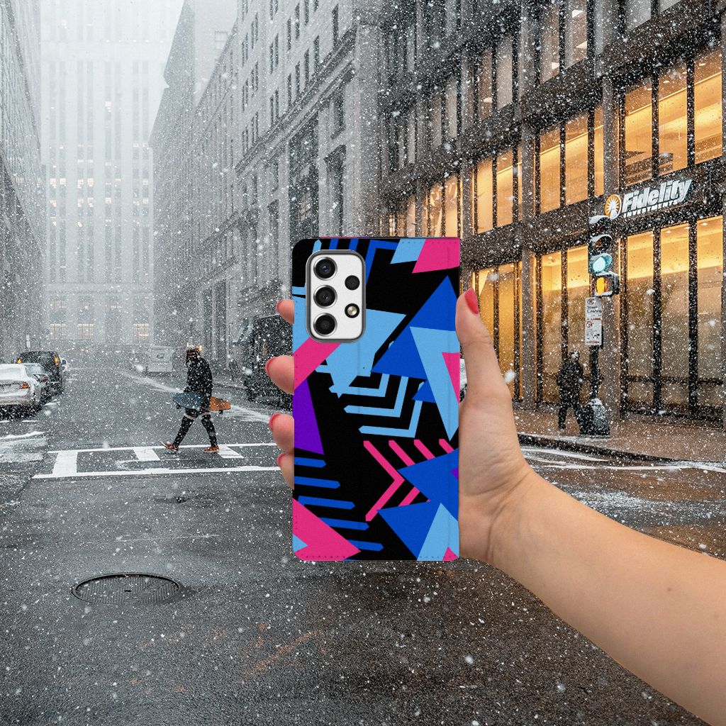 Dit fraaie hoesje met het design Funky Triangle is alles behalve eenvoudig en sober. Dat komt goed uit, want je hebt natuurlijk ook geen doorsnee telefoon gekocht. Mocht je dat wel hebben gedaan, dan wordt hij meteen speciaal als je een Samsung Galaxy A53 Stand Case koopt voor een spotprijsje. Een ding is zeker: opvallen ga je beslist met dit hoesje met paarse, roze en blauwe driehoeken. Jij zult in je element zijn met dit design hoesje met paarse, roze en blauwe driehoeken, omdat het er schitterend uitziet en jouw telefoon perfect beschermt. Het smartphonehoesje beschermt jouw telefoon aan alle zijden en beschikt over 1 opbergvakje en een speciale standaard. Het hoesje wordt afgesloten met een magneet aan de binnenzijde. De houder aan de binnenzijde is van TPU. Alle zijden van de stand case worden bedrukt. De paarse, roze en blauwe driehoeken maken de case helemaal af.