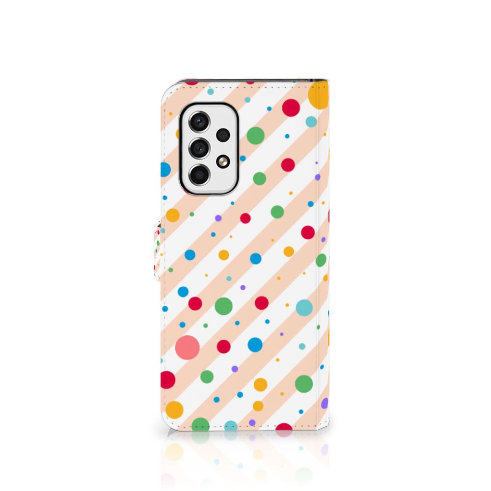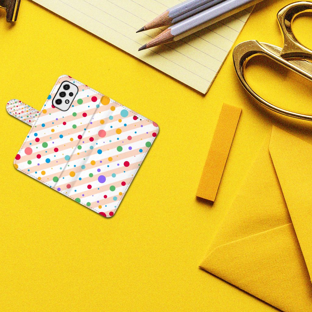 Een Samsung Galaxy A53 Telefoon Hoesje met verschillende kleuren stippen is een schitterende bescherming van jouw smartphone. Het boekhoesje met het design Dots in alle kleuren van de regenboog komt voor jou als geroepen. Maak je geen gebruik van dit zeer mooie hoesje, dan kan het met jouw smartphone een beetje beroerd aflopen. Dit mooie boekhoesje met verschillende kleuren stippen zorgt voor een volledige bescherming van je smartphone en wordt aan alle zijden bedrukt. Sommige stippen staan ook op het magnetische lipje aan de buitenzijde. Verder is de houder aan de binnenzijde van TPU. Jouw telefoon is dus zeer goed opgeborgen en kan geen kant op. Met een hoesje met stippen in verschillende kleuren op alle zijden blijft jouw telefoon volledig in tact. Heb je liever een boekhoesje met stippen in andere opvallende kleuren? Ontwerp dan zelf case met je eigen foto’s en teksten!