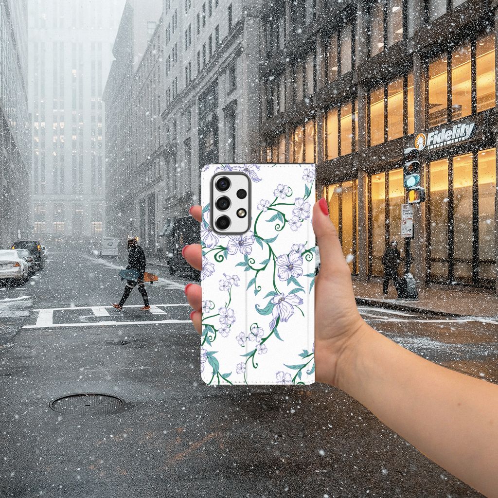 Witte bloemen staan voor puurheid, frisheid, helderheid en eenvoud. Geen wonder dus dat ze al heel lang populair zijn en ook prachtig staan op een telefoonhoesje. Niet iedereen houdt immers van kleurrijke designs. Toch graag bloemetjes op je Smart Cover maar zonder bonte kleuren? Dan is dit hoesje voor de Samsung Galaxy A53 perfect voor jou. Dit populaire smartphonehoesje heeft één vakje voor een pasje of briefgeld en is aan alle zijden bedrukt. Met de standcase zet je je telefoon gemakkelijk neer, zodat je je handen vrij hebt als je bijvoorbeeld een video wilt kijken. De binnenkant van de standcase is van grijs PU-leer. Dat is fijn, omdat je daardoor niet snel vlekken ziet op je hoesje.
