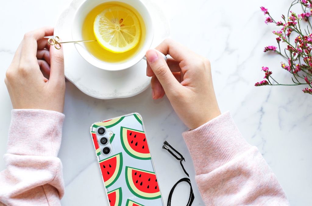 Ben je op zoek naar een uniek telefoonhoesje voor je Samsung Galaxy A54 5G? Dan ben je bij B2C Telecom aan het juiste adres! Speciaal voor jou hebben we dit prachtige Watermelons design in onze collectie hoesjes opgenomen. Het design wordt bedrukt op een Beschermhoes en is gemaakt van flexibel rubber. Het hoesje is perfect voor de actieve smartphonegebruiker door de opstaande randen/hoeken. Denk aan mensen die veel sporten, reizen of wandelen en net iets meer zekerheid willen als het op hun geliefde telefoon aankomt. Het design wordt alleen aan de bovenkant van het hoesje bedrukt en de randen blijven transparant. Aan de zijkanten zijn uitsparingen gemaakt waardoor je met gemak alle knoppen en poorten kunt bedienen. Wij adviseren om dit hoesje in combinatie met een screenprotector te gebruiken voor een langere levensduur van je telefoon. Wil je dit hoesje nog iets extra's geven? Voeg dan gratis je naam of een quote toe! Is dit design hoesje toch niet helemaal wat je zocht? Ontwerp dan zelf een hoesje in ons ontwerpprogramma.