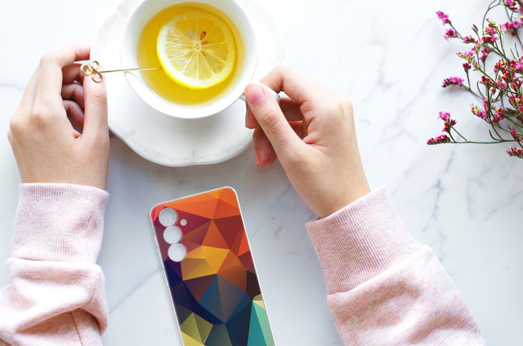 Veelkleurige driehoeken die samen eindeloze asymmetrische patronen lijken te vormen. Het is het abstracte schouwspel dat op dit fraaie hoesje voor je Samsung Galaxy A54 5G direct de aandacht trekt noemen we voor het gemak trekt noemen we voor het gemak Polygon Color. De een ziet er een berglandschap in, de ander piramides. Wat zie jij erin? Zeker is in elk geval dat de aanblik van dit fascinerende ontwerp je niet snel gaat vervelen. Het kleurige spel van lijnen en vlakken blijft eindeloos boeien en geeft jouw TPU Hoesje een hippe en kunstzinnige uitstraling. De kracht die het lijnenspel uitstraalt, komt ook terug in het hoesje zelf. Dit hoesje wordt alleen aan de bovenkant bedrukt en is zeer flexibel. De randen van het hoesje blijven transparant. Wat wil je nog meer?