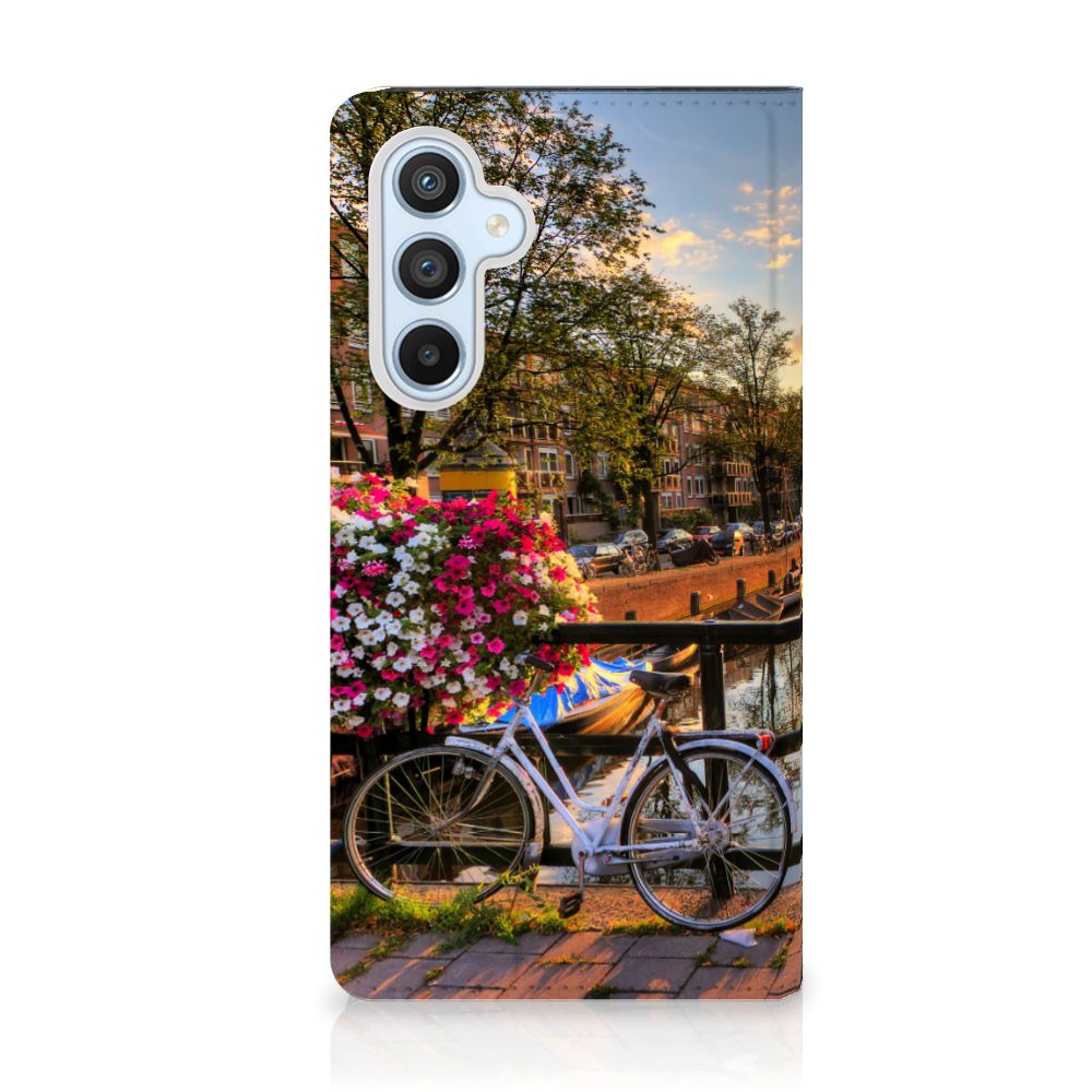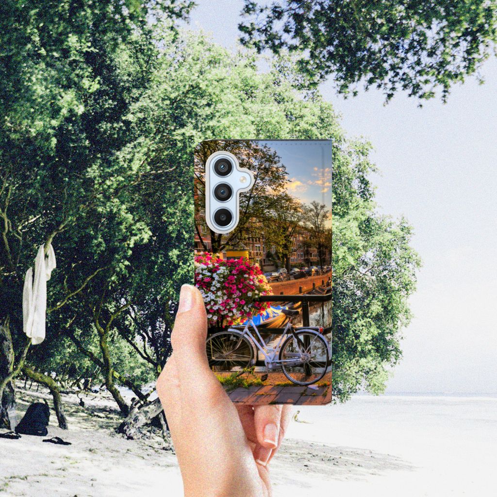 Amsterdam is meer dan ooit een toeristische trekpleister. Een bezoek aan de hoofdstad is niet compleet als er geen bezoek is gebracht aan de Amsterdamse Grachten. Ze zijn een symbool van de stad en hebben een enorme culturele en historische waarde. Daarom kunnen ze natuurlijk niet ontbreken in onze collectie design hoesjes. Dit schitterende design hoesje met Amsterdamse grachten tref je enkel en alleen aan bij B2C Telecom. De ondergaande zon en de fleurige en fraaie bloempakketten zorgen voor een prachtig totaalplaatje. Amsterdam is wereldberoemd om haar prachtige grachten uit de zeventiende eeuw. Dit smartphone hoesje is hier een eerbetoon aan. Het design staat op een stand case. Deze Samsung Galaxy A54 Book Cover beschermt jouw telefoon aan alle kanten en beschikt over een 1 opbergvakje en een speciale standaard. Het hoesje wordt afgesloten met een magneet aan de binnenzijde. De houder aan de binnenzijde is van TPU. Alle zijden van de stand case worden bedrukt.