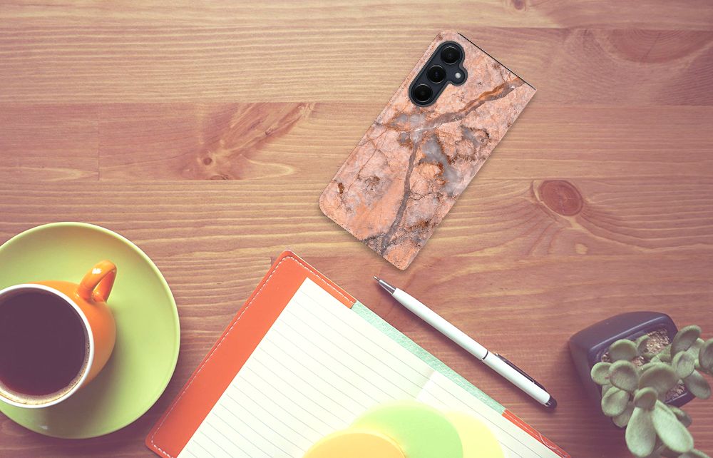 Dit design hoesje met Marmer Oranje is zeer geschikt voor jouw kostbare telefoon. Vanwege zijn prachtige lichtval en vastheid is marmer een zeer gewild bouwmateriaal. Wij kunnen inmiddels concluderen dat dit hoesje met oranje marmer ook zeer gewild is. Beloon jezelf en je telefoon met dit hele mooie Samsung Galaxy A55 Standcase. Naast het oranje marmer zijn er de diverse marmersoorten in een ruim kleurenpallet te krijgen. Deze stand case met marmer in oranje wordt bedrukt op alle zijden. De case beschikt over een vakje voor een pasje en toebehoren en een magnetische sluiting aan de binnenzijde. Verder heeft de case in oranje marmer een houder van TPU. Wij hebben onze designer veel vrijheid gegeven met het ontwerpen dit mooie hoesje. Het resultaat zie je terug in deze stand case met oranje marmer, dat de ideale bescherming is voor jouw smartphone. Des te mooi dat wij voor variatie hebben gekozen door een hoesje met oranje marmer aan de bieden.
