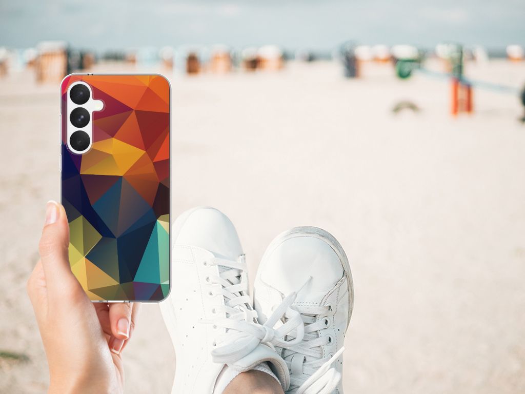 Veelkleurige driehoeken die samen eindeloze asymmetrische patronen lijken te vormen. Het is het abstracte schouwspel dat op dit fraaie hoesje voor je Samsung Galaxy A55 direct de aandacht trekt noemen we voor het gemak trekt noemen we voor het gemak Polygon Color. De een ziet er een berglandschap in, de ander piramides. Wat zie jij erin? Zeker is in elk geval dat de aanblik van dit fascinerende ontwerp je niet snel gaat vervelen. Het kleurige spel van lijnen en vlakken blijft eindeloos boeien en geeft jouw TPU Hoesje een hippe en kunstzinnige uitstraling. De kracht die het lijnenspel uitstraalt, komt ook terug in het hoesje zelf. Dit hoesje wordt alleen aan de bovenkant bedrukt en is zeer flexibel. De randen van het hoesje blijven transparant. Wat wil je nog meer?
