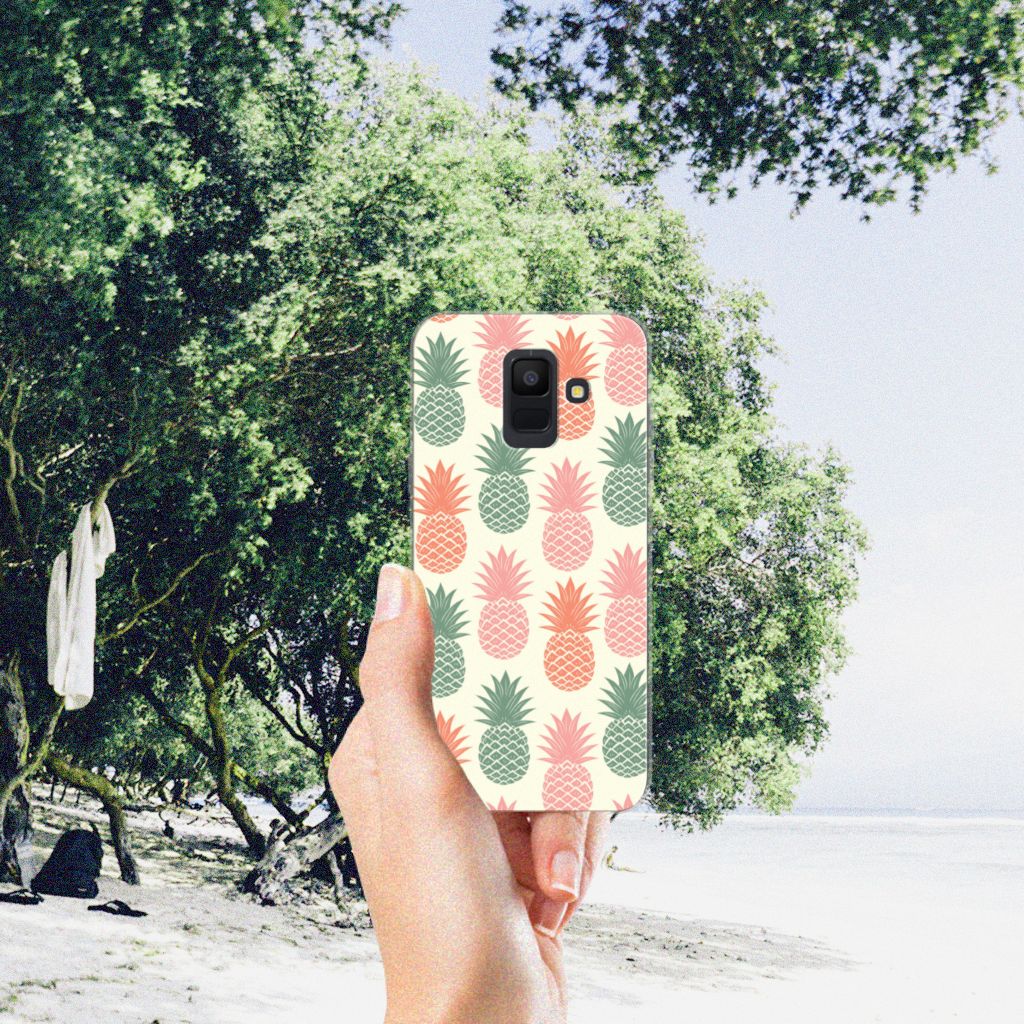 Ananas is een woord uit het Tupi, de taal van de Tupi-indianen, en betekent uitmuntende vrucht. Dit fruit van zeer hoge kwaliteit staat op onze superieure boekhoesjes, stand cases, hard cases en TPU cases. Jij blijft er gezond uitzien als je zo nu en dan een hap neemt van een Ananas , jouw smartphone blijft tip top in orde als je er een leuk telefoonhoesje omheen doet. Een ananas heeft stevig, veerkrachtig vruchtvlees. Een beetje te vergelijken met het TPU in onze hoesjes. TPU is elastisch materiaal, dat zeer buigzaam is. Vandaar dat het zeer schokbestendig is. Het ananas design staat op een staat op een TPU case. Deze Samsung Galaxy A6 (2018) Siliconen Case wordt alleen aan de bovenkant bedrukt en is zeer flexibel. De randen van het hoesje blijven transparant.