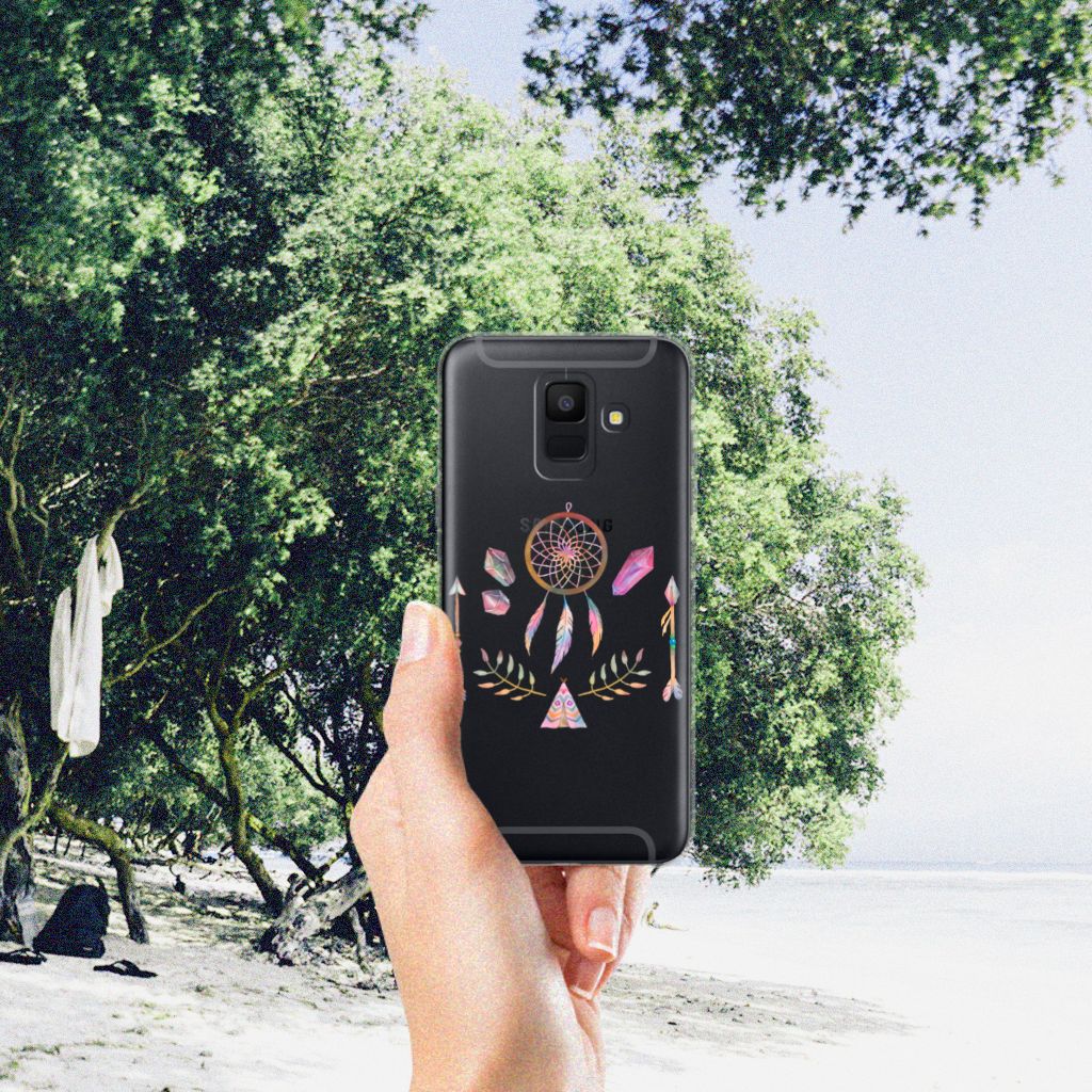 Een dromenvanger werd lang geleden al door een indianenvolk in Noord-Amerika gebruikt om nare dromen te weren. Nu nog hangen mensen over de hele wereld dromenvangers boven hun bed. Maar ook op een telefoonhoesje staat zo’n boho dreamcatcher heel mooi. Dit mooie design dat bestaat uit een tipi, pijlen en dromenvanger heeft veel verschillende prachtige kleuren. Maar omdat het ontwerp minimalistisch en klein is, is het design toch subtiel te noemen. Dit ontwerp staat op een Telefoonhoesje met Naam voor je Samsung Galaxy A6 (2018). TPU is flexibel en heel erg sterk. Zo is je telefoon aan de achterkant en de randen heel goed beschermd. De case is aan de bovenkant bedrukt, de randen blijven transparant. Het TPU-hoesje is perfect te combineren met een screenprotector, zo zijn je telefoon en je beeldscherm altijd goed beschermd.