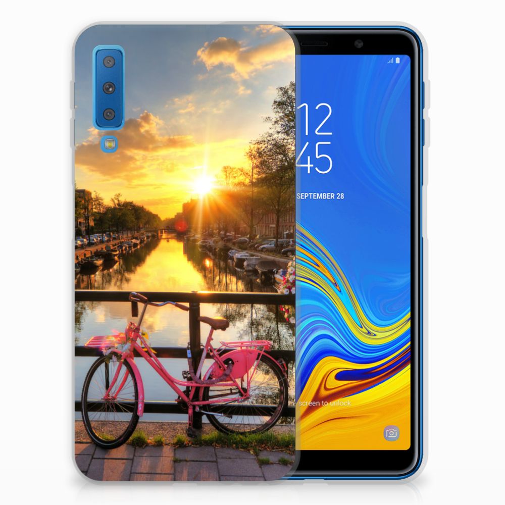 Amsterdam is meer dan ooit een toeristische trekpleister. Een bezoek aan de hoofdstad is niet compleet als je niet aanlegt bij de Amsterdamse Grachten. Ze zijn een symbool van de stad en hebben een enorme culturele en historische waarde. Daarom kunnen ze natuurlijk niet ontbreken in onze collectie design hoesjes. Dit schitterende design hoesje met Amsterdamse grachten tref je enkel en alleen aan bij B2C Telecom. De ondergaande zon en de fleurige en fraaie bloempakketten zorgen voor een prachtig totaalplaatje. Amsterdam is wereldberoemd om haar prachtige grachten uit de zeventiende eeuw. Dit smartphone hoesje is hier een eerbetoon aan. Het design staat op een TPU case. Dit Samsung Galaxy A7 (2018) Siliconen Back Cover wordt alleen aan de bovenkant bedrukt en is zeer flexibel. De randen van het hoesje blijven transparant.