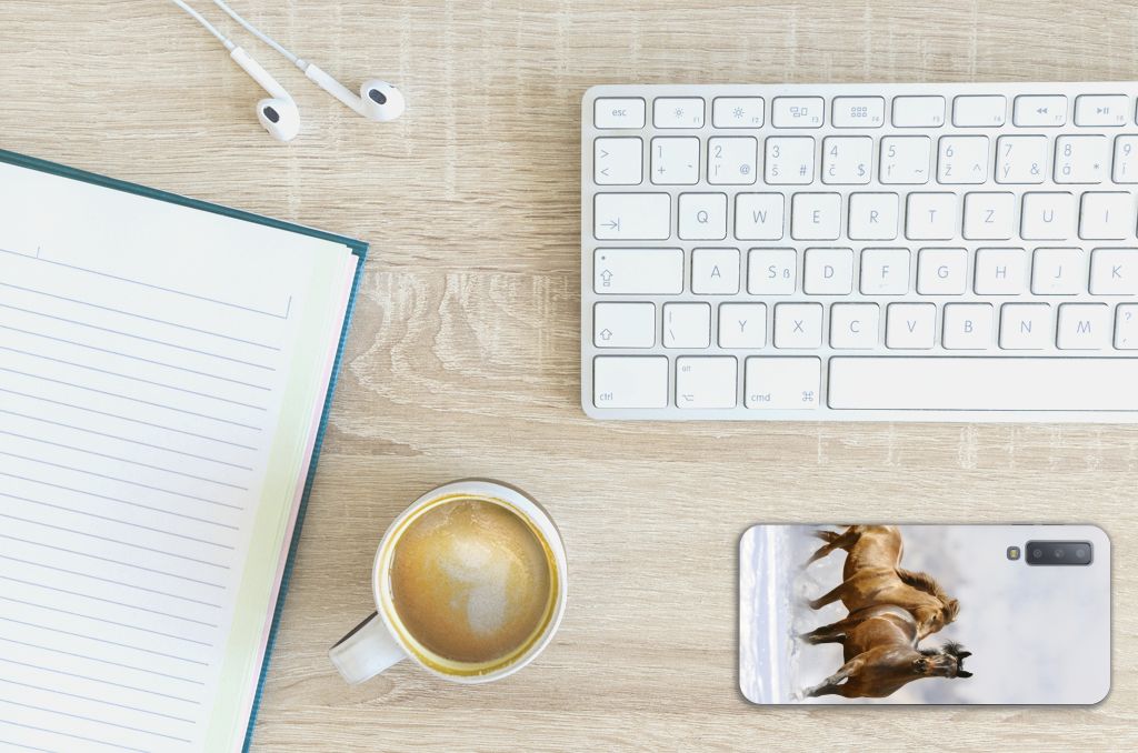 Voor de paardenliefhebbers onder ons hebben we onze collectie uitgebreid met dit design hoesje met print van paarden. Vroeger hield de mens vooral werkpaarden, inmiddels hebben we vriendschap gesloten met het paard. Vandaar dat het ook een favoriet dier is op onze smartphonehoesjes, zoals deze tpu case. Een TPU Hoesje voor de Samsung Galaxy A7 (2018) met Paarden is niet alleen super mooi en chique, maar ook nog eens zeer flexibel. Verder is de case schokabsorberend en heeft het opstaande randen. Zie je liever je eigen paard terug op een hoesje. Dat kan! Door zelf een uniek hoesje te ontwerpen, met eigen foto’s en teksten. De TPU case wordt aan de bovenzijde bedrukt, de zijkanten blijven transparant.