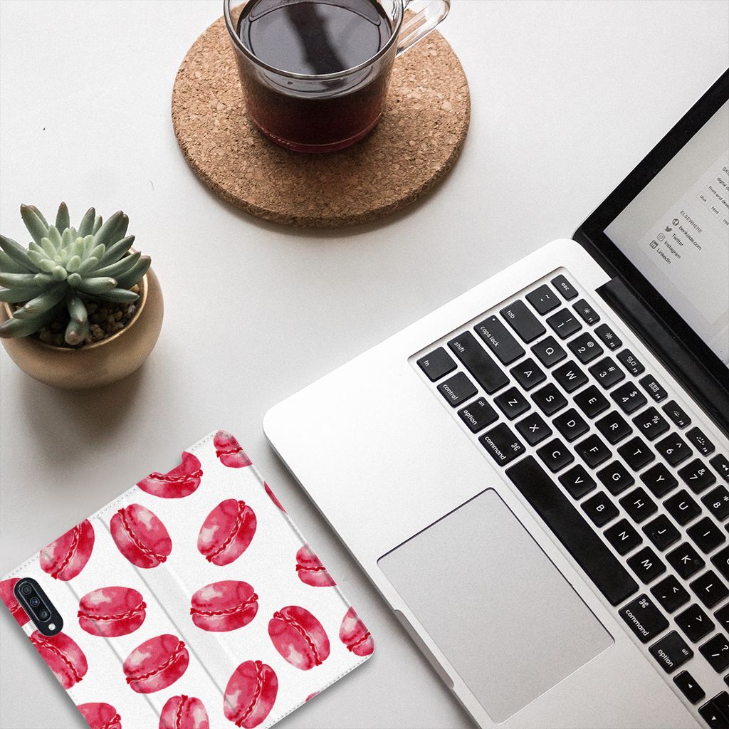 Dit stand hoesje met Pink Macarons is een zeer opvallende bescherming voor jouw smartphone. Macarons zijn Franse koekjes: kleine, rond en luchtig. Ze worden in veel verschillende smaken gemaakt, herkenbaar aan de verschillende kleuren zoals chocolade (donkerbruin), mokka (middenbruin), kersen (rood), pistache (groen), aardbei (roze), framboos (karmijn). Deze kleuren kun je net allemaal zien op dit fraaie design hoesje met roze macarons. Heb je altijd al een Samsung Galaxy A70 Flip Style Cover willen hebben met roze macarons? Grijp dan nu je kans. Deze case heeft zeer veel goede eigenschappen, zoals 1 opbergvakje en een magnetische sluiting aan de binnenkant. Dit design hoesje met roze macarons wordt aan alle zijden bedrukt. De houder aan de binnenkant van het hoesje is van TPU. De case heeft ook een handige standaard.
