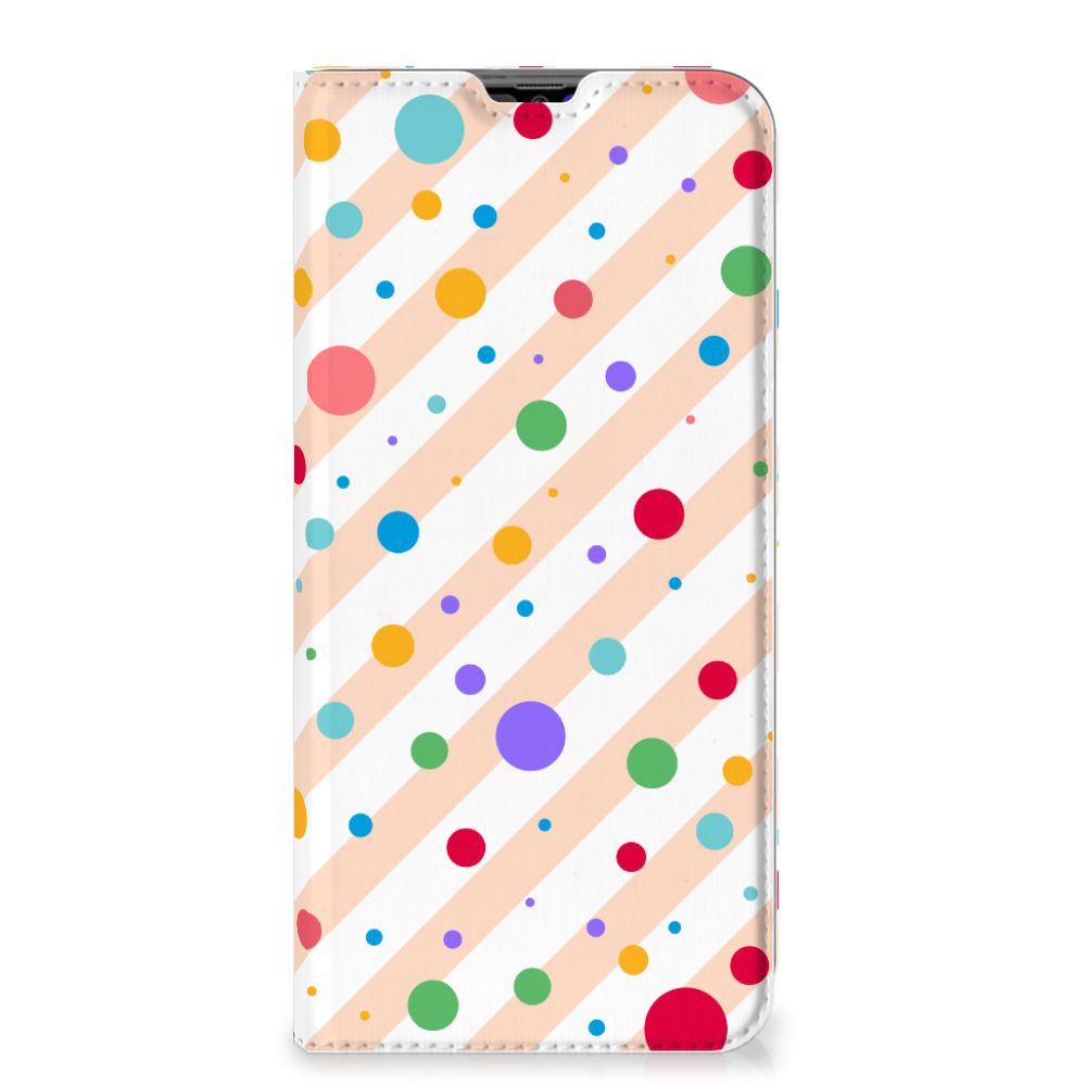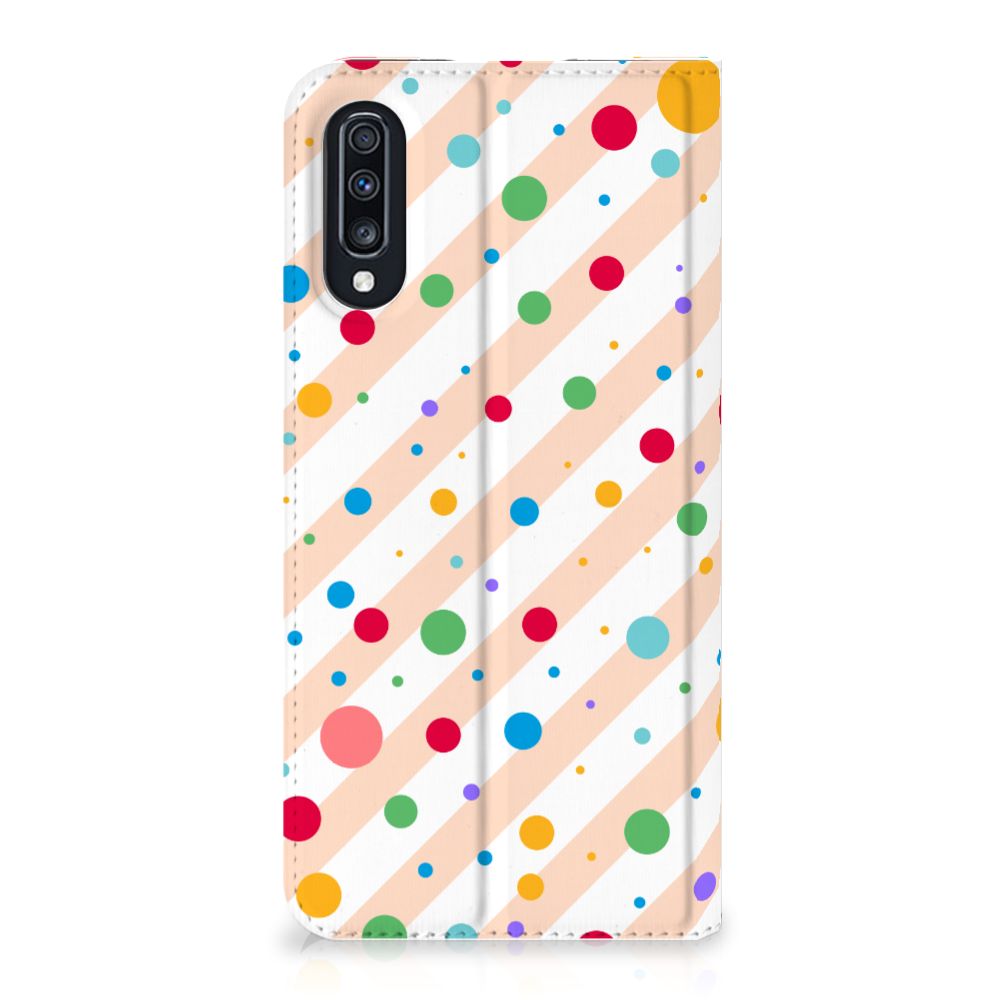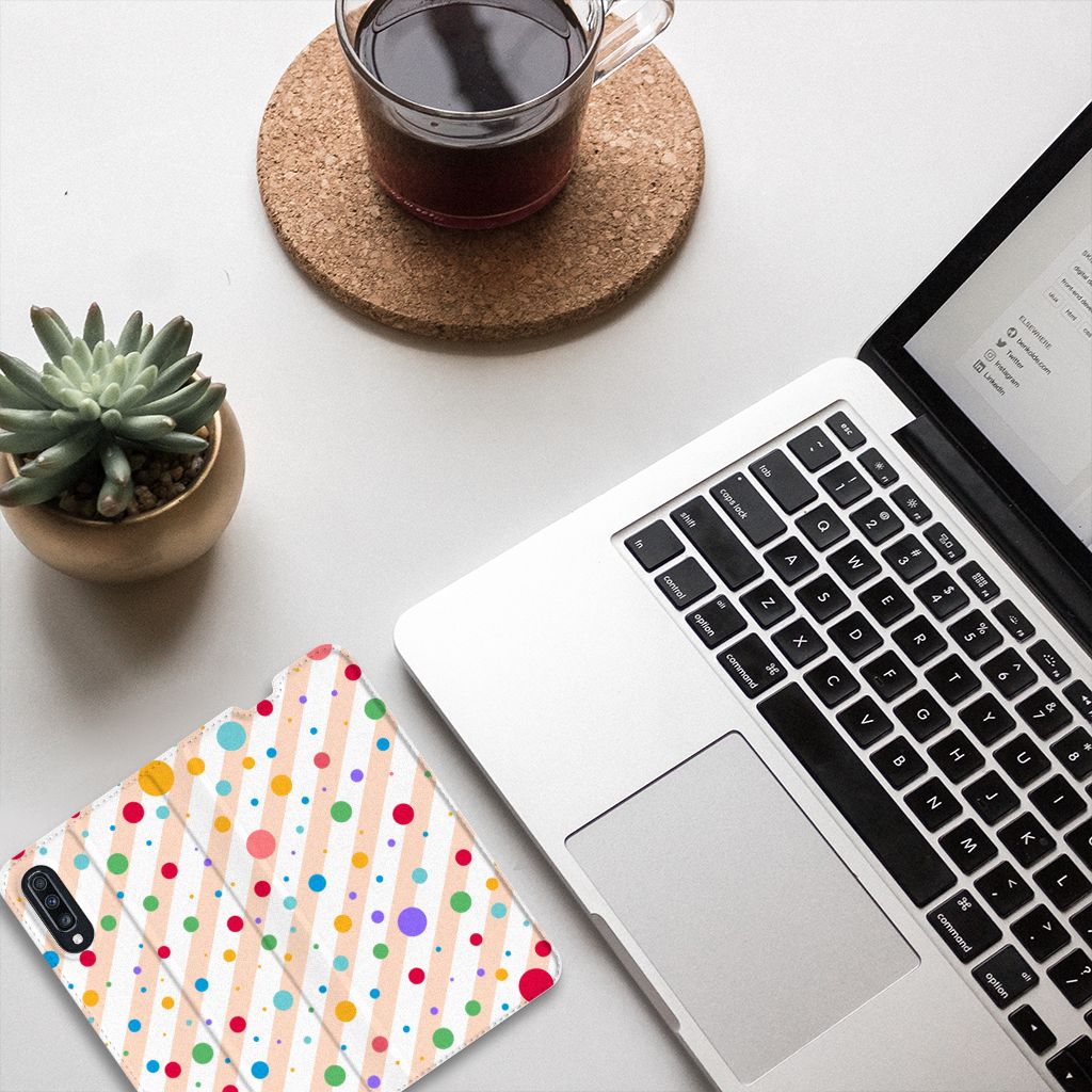 Een Samsung Galaxy A70 Hoesje met Magneet met verschillende kleuren stippen is een schitterende bescherming van jouw smartphone. De stand case met het design Dots in alle kleuren van de regenboog komt voor jou als geroepen. Maak je geen gebruik van dit zeer mooie hoesje, dan kan het met jouw smartphone een beetje beroerd aflopen. Dit mooie stand hoesje met verschillende kleuren stippen zorgt voor een volledige bescherming van je smartphone en wordt aan alle zijden bedrukt. Dankzij de speciale standaard kun je rustig achteroverleunend filmpjes bekijken terwijl je je handen vrij hebt. Verder is de houder aan de binnenzijde van TPU. Jouw telefoon is dus zeer goed opgeborgen en kan geen kant op. Met een hoesje met stippen in verschillende kleuren op alle zijden blijft jouw telefoon volledig in tact. Heb je liever een stand case met stippen in andere opvallende kleuren? Ontwerp dan zelf case met je eigen foto’s en teksten!