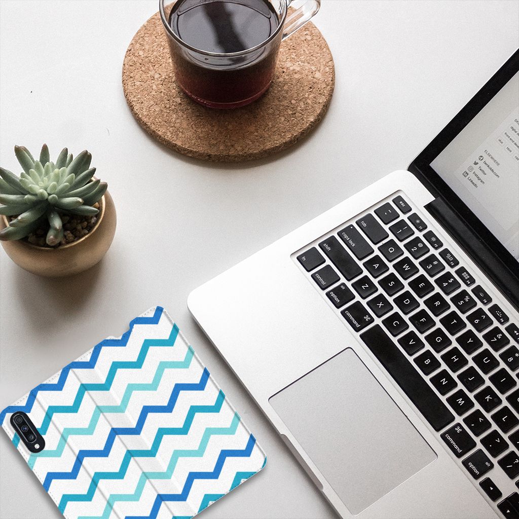 Dit zigzag blauwe design hoesje is speciaal ontworpen voor jou. We hebben bewust verschillende stijlen blauw gebruikt, zodat er voldoende sprake is van variatie. Dit blauwwitte Hoesje met Magneet ziet er super strak uit. Dat kan ook niet anders, als je weet dat onze zeer talentvolle designer er hoogstpersoonlijk voor verantwoordelijk is. Hij schudt wekelijks nieuwe designs uit zijn mouw en dit zigzag blauwe hoesje is een van zijn fraaiste creaties. Een heel dik design hoesje, al zeggen we het zelf. Valt dit blauwwitte design hoesje goed bij jou? Bestel het dan vandaag nog en je hebt het morgen in huis. Het design staat op een stand case. Deze case beschermt jouw Samsung Galaxy A70 aan alle kanten en beschikt over een 1 opbergvakje en een speciale standaard. Het hoesje wordt afgesloten met een magneet aan de binnenzijde. De houder aan de binnenzijde is van TPU. Alle zijden van de stand case worden bedrukt.