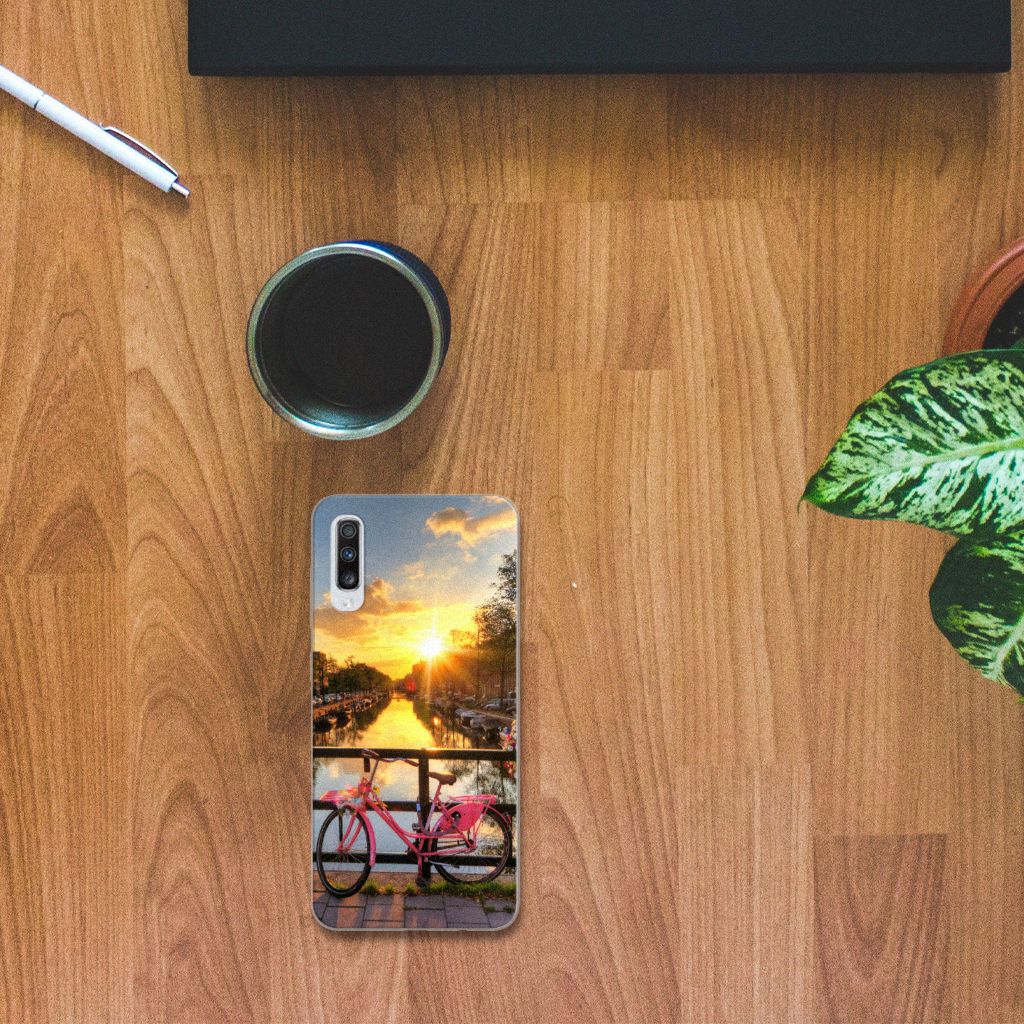Amsterdam is meer dan ooit een toeristische trekpleister. Een bezoek aan de hoofdstad is niet compleet als je niet aanlegt bij de Amsterdamse Grachten. Ze zijn een symbool van de stad en hebben een enorme culturele en historische waarde. Daarom kunnen ze natuurlijk niet ontbreken in onze collectie design hoesjes. Dit schitterende design hoesje met Amsterdamse grachten tref je enkel en alleen aan bij B2C Telecom. De ondergaande zon en de fleurige en fraaie bloempakketten zorgen voor een prachtig totaalplaatje. Amsterdam is wereldberoemd om haar prachtige grachten uit de zeventiende eeuw. Dit smartphone hoesje is hier een eerbetoon aan. Het design staat op een TPU case. Dit Samsung Galaxy A70 Siliconen Back Cover wordt alleen aan de bovenkant bedrukt en is zeer flexibel. De randen van het hoesje blijven transparant.