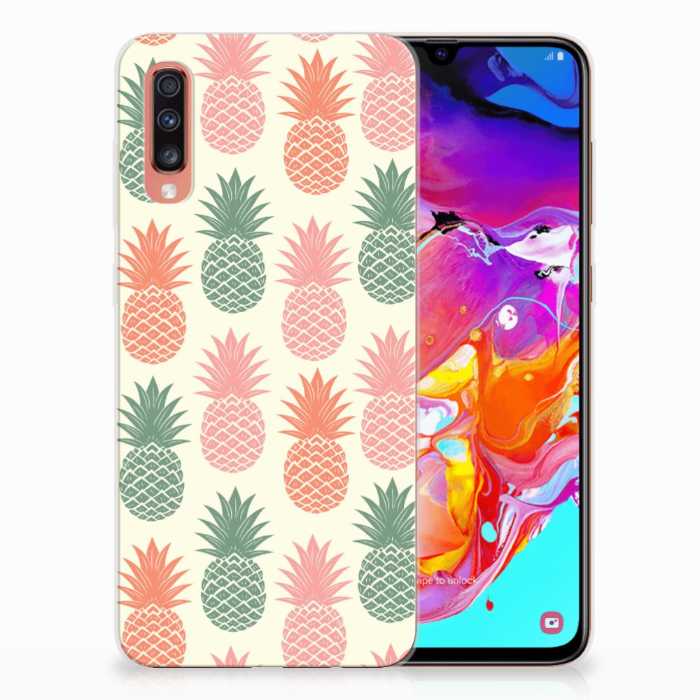 Ananas is een woord uit het Tupi, de taal van de Tupi-indianen, en betekent uitmuntende vrucht. Dit fruit van zeer hoge kwaliteit staat op onze superieure boekhoesjes, stand cases, hard cases en TPU cases. Jij blijft er gezond uitzien als je zo nu en dan een hap neemt van een Ananas , jouw smartphone blijft tip top in orde als je er een leuk telefoonhoesje omheen doet. Een ananas heeft stevig, veerkrachtig vruchtvlees. Een beetje te vergelijken met het TPU in onze hoesjes. TPU is elastisch materiaal, dat zeer buigzaam is. Vandaar dat het zeer schokbestendig is. Het ananas design staat op een staat op een TPU case. Deze Samsung Galaxy A70 Siliconen Case wordt alleen aan de bovenkant bedrukt en is zeer flexibel. De randen van het hoesje blijven transparant.