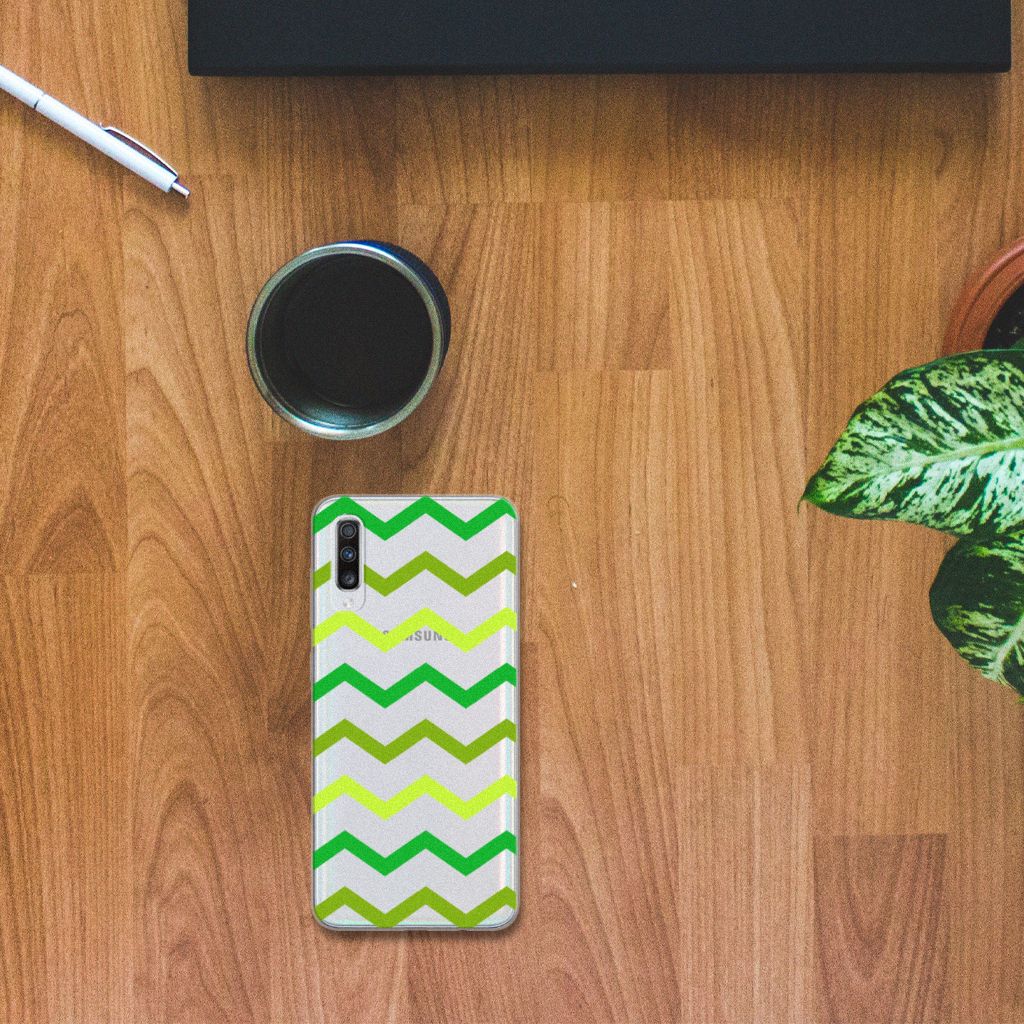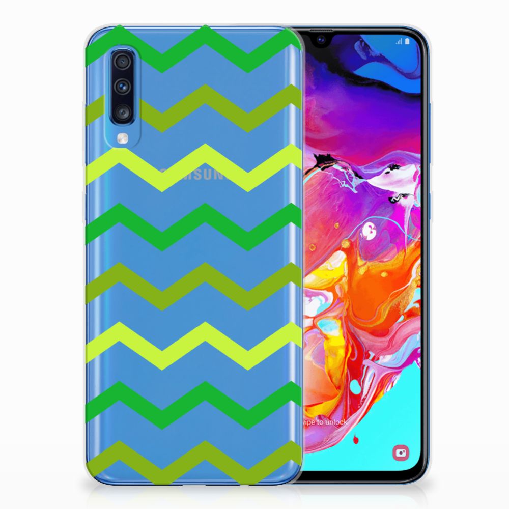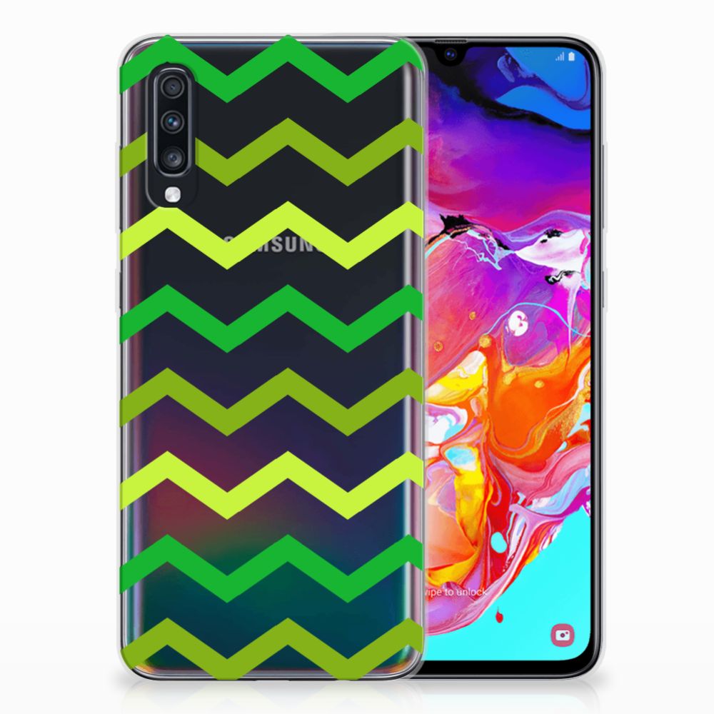 Dit zigzag groene design hoesje is speciaal ontworpen voor jou. We hebben bewust verschillende stijlen groen gebruikt, zodat er voldoende sprake is van variatie. Dit groene hoesje ziet er super strak uit. Dat kan ook niet anders als je weet dat onze designer zijn creativiteit heeft gebruikt. Hij schudt voortdurend nieuwe designs uit zijn mouw en dit zigzag groene hoesje is een van zijn fraaiste creaties. Een heel tof Samsung Galaxy A70 TPU bumper, al zeggen we het zelf. Valt dit Zigzag Groen design hoesje goed bij jou? Bestel het dan vandaag nog en je hebt het morgen in huis. Het design staat op een TPU case. Dit hoesje wordt alleen aan de bovenkant bedrukt en is zeer flexibel. De randen van het hoesje blijven transparant en worden niet bedrukt. Met dit hoesje past jouw telefoon altijd in je broekzak.