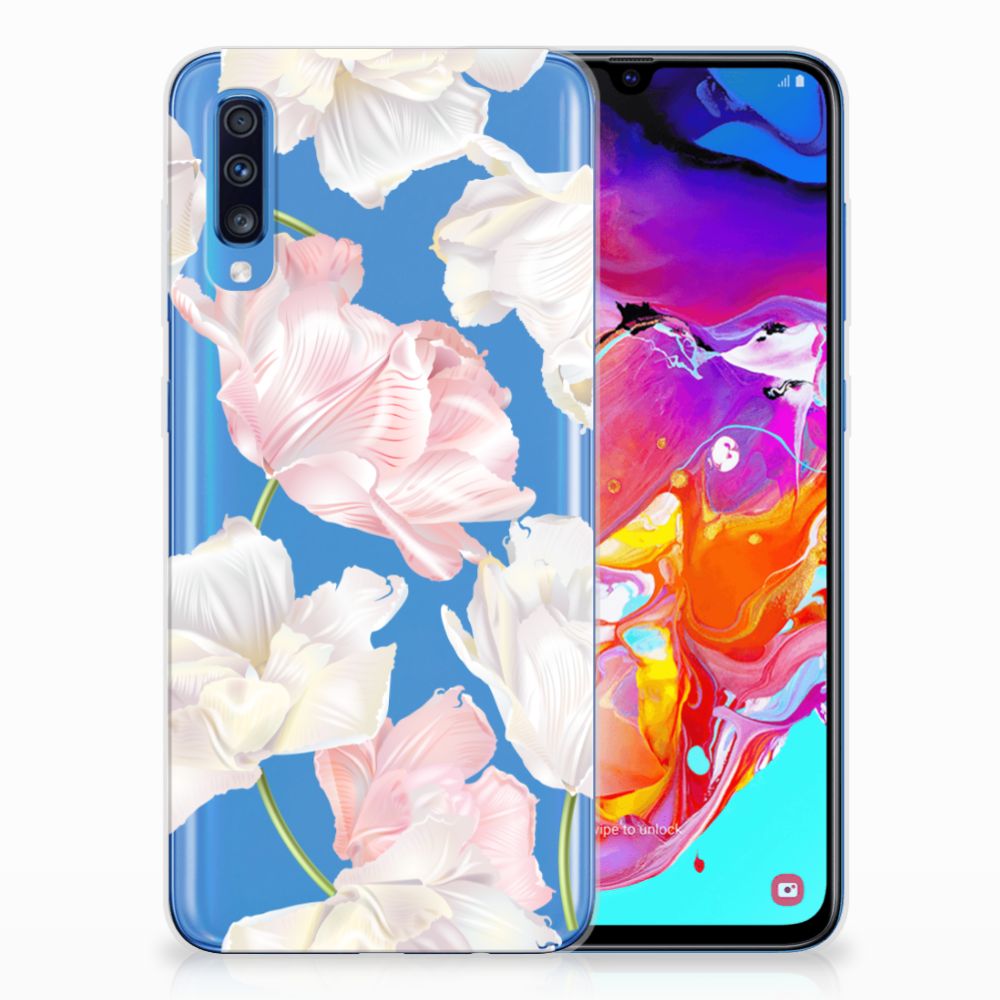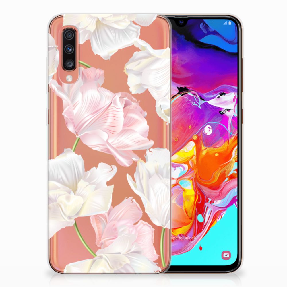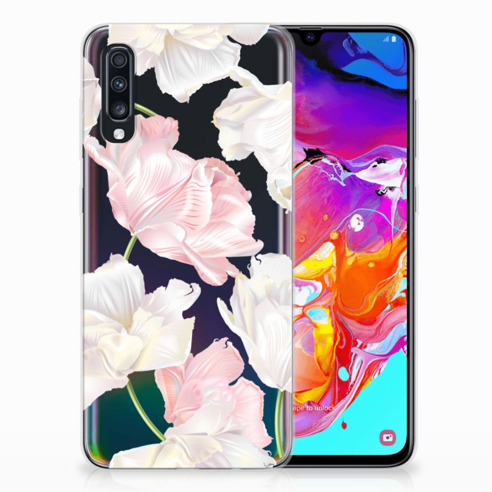 Een bosje bloemen doet een mens (en zijn smartphone) goed. De witte en roze bloemen op deze Samsung Galaxy A70 TPU Case geven jouw smartphone een zeer mooie uitstraling. Je wordt er ook meteen een stuk rustiger van als je aan het appen of aan het bellen bent. Valt dan je telefoon op de grond, dan zal er dankzij de tpu case met het design Lovely Flowers ontstaan. Helemaal niet als je er een screenprotector bij hebt gekocht. Onze tpu cases met roze en witte bloemen zien er zeer prettig uit en zijn heel praktisch, getuige onder meer de opstaande randen en het flexibele materiaal. Alleen de achterkant van de tpu case wordt bedrukt met roze en witte bloemen. Op deze tpu case kun je trouwens ook een eigen ontwerp zetten. In een paar simpele stappen ontwerp je zelf een stand case met daarop jouw favoriete bloemen.