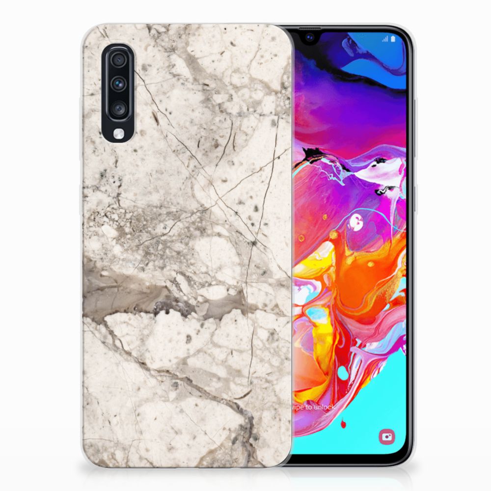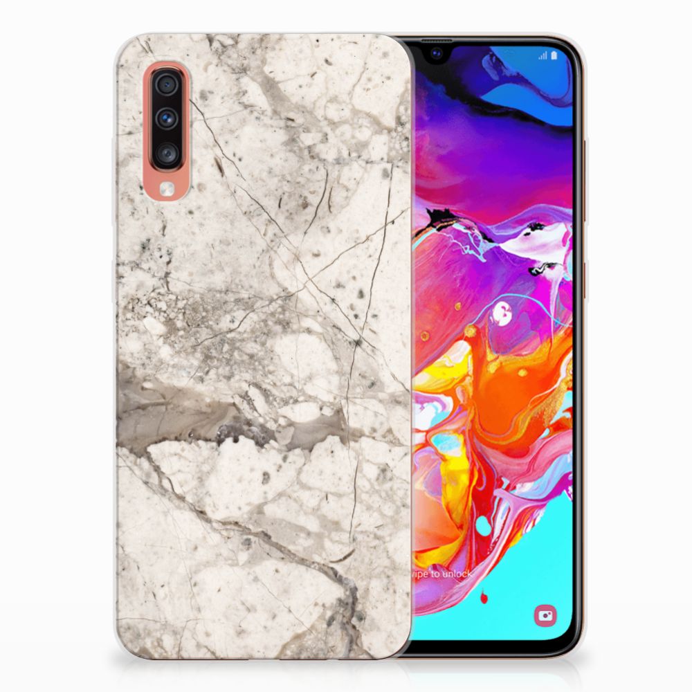 Dit design hoesje met Marmer Beige is voor de artistieke personen onder ons. De Grieken en Romeinen wisten het steen al te waarderen door het als bouw- en bekledingsmateriaal toe te passen. Naast het witte Carrara marmer met haar zacht grijze geaderde belijning zijn de diverse marmersoorten in een ruim kleurenpallet te krijgen. We hebben verschillende kleuren op design hoesjes gezet, zoals in dit geval beige marmer. Dit is een Samsung Galaxy A70 TPU Siliconen Hoesje met marmer in beige kleur. Het marmer wordt bedrukt op de voorkant van een tpu case, die beschikt over opstaande randen aan de voorkant en goed combineert met een screenprotector. De rijkheid aan kleuren en varianties in afwerking geeft designers de vrijheid om met marmer hele mooie architectonische projecten te realiseren. Wij hebben onze designer ook veel vrijheid gegeven. Het resultaat zie je terug in deze tpu case met beige marmer, die jouw smartphone goed beschermt. De zijkanten van de case worden niet bedrukt met marmer.