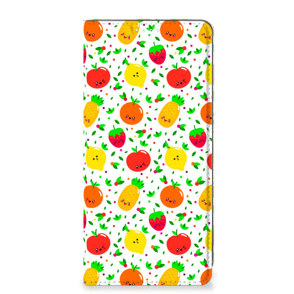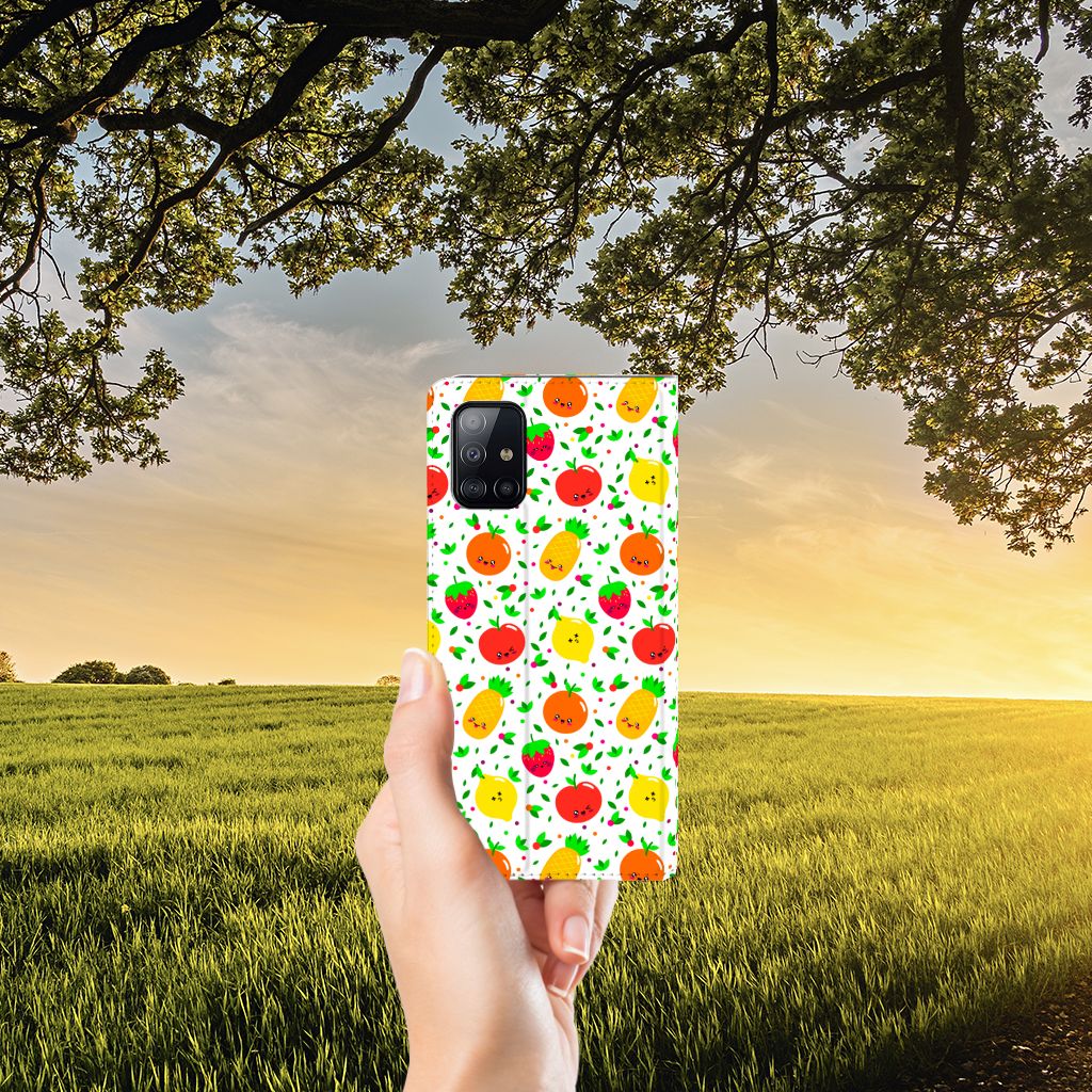 Een fris, fruitig en vrolijk hoesje, deze case met afbeeldingen van aardbeien, ananassen, appels, sinaasappels en citroenen. Minstens twee stuks fruit per dag wordt aanbevolen als dagelijkse hoeveelheid voor de mens. Dit verkleint de kans op allerlei ziekten. Dus met het aantal stukken fruit op de Samsung Galaxy A71 Flip Style Cover zou je wel een maandje zoet moeten zijn. Met het hoesje zelf kun je je hele leven doen, dit is namelijk niet stuk te krijgen. Dit komt door het sterke en flexibele materiaal waarvan het gemaakt is. De vrolijk stemmende case het desing Fruits maakt jouw telefoon dus zeer duurzaam. Zorg ervoor dat jouw smartphone gezond blijft en kies voor dit hoesje met frivool fruit. Een stand case met fruit beschermt jouw telefoon aan alle kanten en beschikt over een 1 opbergvakje en een speciale standaard. Het hoesje met fruit wordt afgesloten met een magneet aan de binnenzijde. De houder aan de binnenzijde is van TPU.
