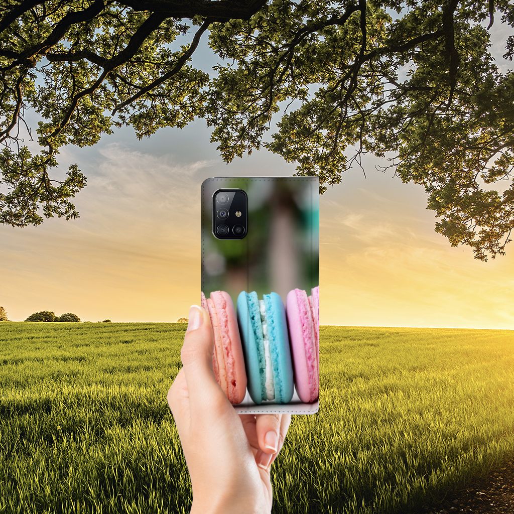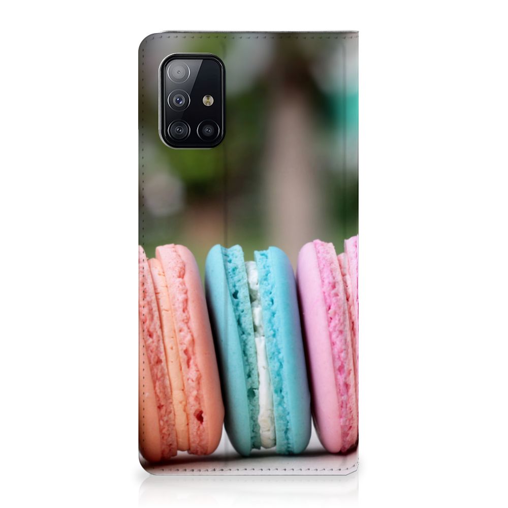 Dit stand hoesje met macarons is een zeer opvallende bescherming voor jouw smartphone. Macarons zijn Franse koekjes: kleine, rond en luchtig. Ze zijn aan elkaar geplakt met een zachte vulling. Ze worden in veel verschillende smaken gemaakt, herkenbaar aan de verschillende kleuren zoals chocolade (donkerbruin), mokka (middenbruin), kersen (rood), pistache (groen), aardbei (roze), framboos (karmijn), citroen (geel) en kokos (roomwit). Deze kleuren kun je natuurlijk ook zien op dit fraaie design hoesje met macarons. Heb je altijd al een Samsung Galaxy A71 Flip Style Cover willen hebben met macarons? Grijp dan nu je kans. Deze case heeft zeer veel goede eigenschappen, zoals 1 opbergvakje en een magnetische sluiting aan de binnenkant. Dit design hoesje met macarons wordt aan alle zijden bedrukt. De houder aan de binnenkant van het hoesje is van TPU. De case heeft ook een handige standaard.