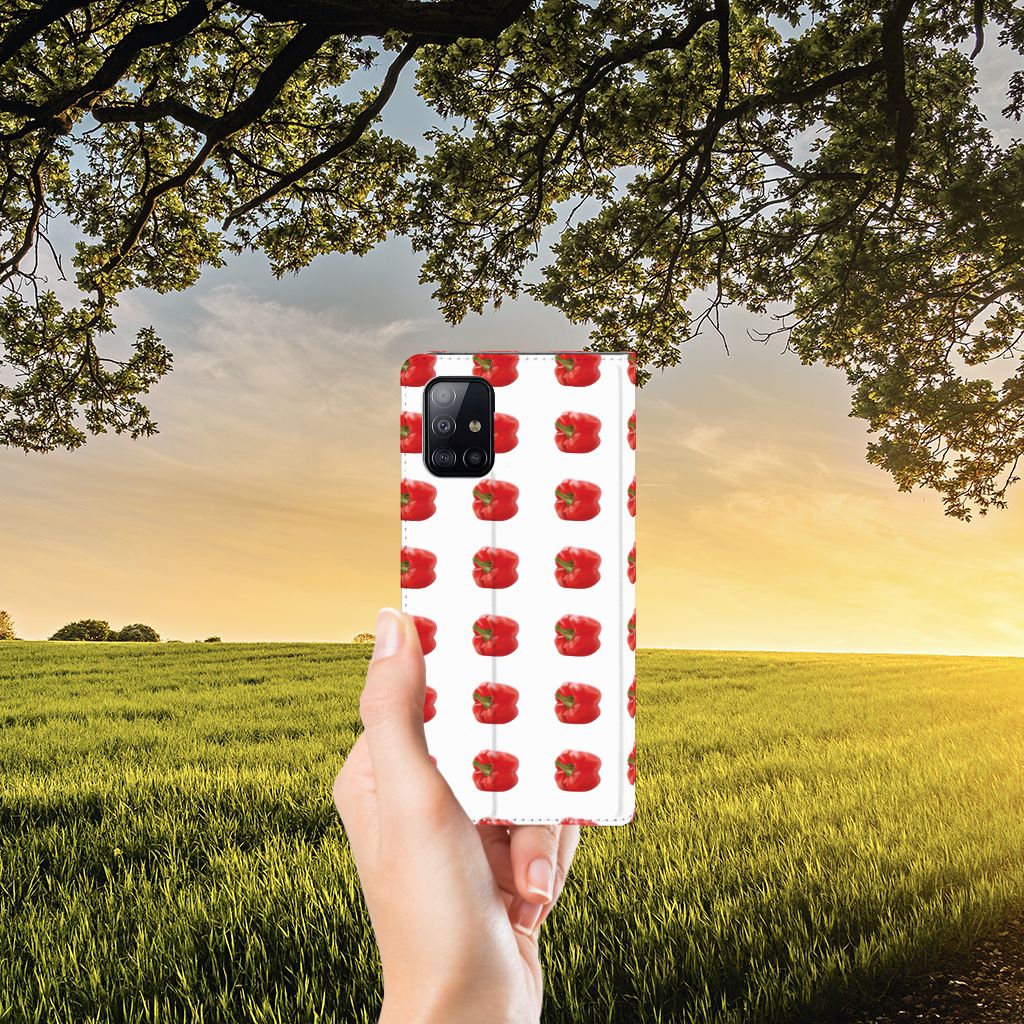 Er zit pit in jouw Samsung Galaxy A71 Flip Style Cover dankzij dit design met rode paprika’s. Paprika’s zijn er in allerlei kleuren en vormen en ze hebben gemeen dat ze heel erg gezond zijn. De rode paprika’s op deze case staan op een grijs met witte geblokte achtergrond en vormen een opvallende verschijning. Heb jij ooit iemand in je nabije omgeving rond zien lopen met een design hoesje met rode paprika’s? Waarschijnlijk niet. Dit stand hoesje met rode paprika’s beschermt jouw telefoon aan alle zijden en beschikt over een opbergvakje voor een pasje of briefgeld. De case sluit perfect af met de magneet aan de binnenzijde. Zeker weten dat je met dit hoesje met rode paprika’s een smartphone accessoire te pakken hebt waarmee je jezelf in de schijnwerpers zet. De houder aan de binnenzijde van de stand case met rode paprika’s is van TPU. Als je andere kleuren paprika’s op je hoesje wilt, raden we je aan ons assortiment design hoesjes te bekijken of zelf een hoesje te ontwerpen.
