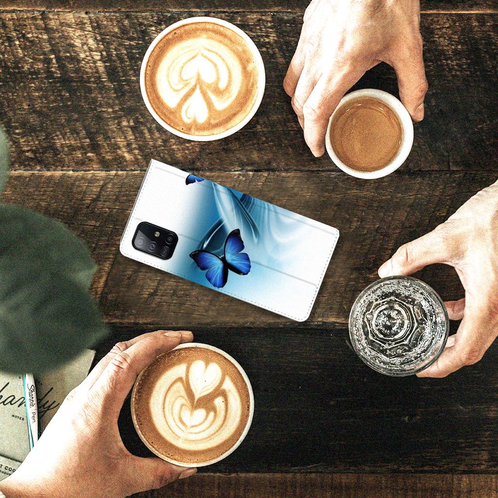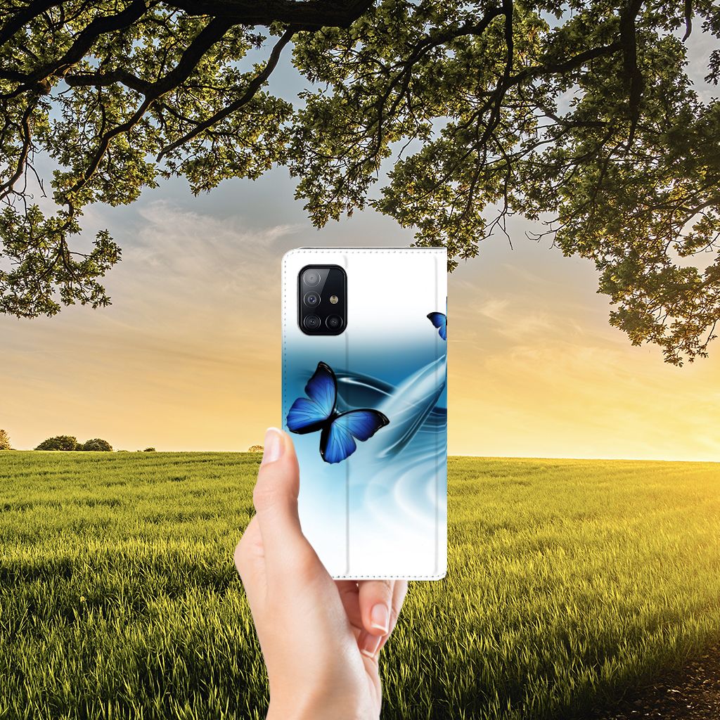 Deze vrolijke Samsung Galaxy A71 Hoesje maken met blauwe vlinders is een ware eyecatcher. De meeste vlinders hebben een onopvallende vleugelkleur, andere soorten hebben juist heldere en felle kleuren. Wij kunnen deze blauwe vlinders op een zeer handige stand case zetten. Deze hoesjes zijn het meest gewild. Met onze geavanceerde printer zetten we de afbeelding van vlinders op alle zijden van het hoesje. De case met vlinders heeft aan de binnenkant een houder waarin je jouw creditcard of ander pasje kwijt kunt. De case heeft bovendien een handige standaard. Verder is je telefoon natuurlijk maximaal beschermd met deze stand case met print van blauwe vlinders. De houder aan de binnenzijde van het design hoesje met vlinder print is van TPU.