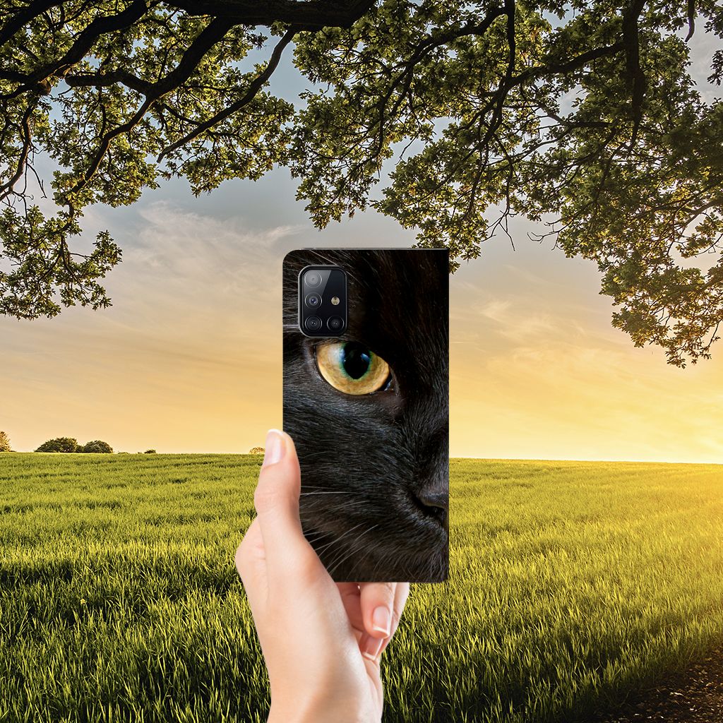 warte katten zijn heel speciaal, vandaar we een exemplaar op een design hoesje hebben gezet. Een zwarte kat schijnt bijvoorbeeld veel beter te kunnen horen dan witte katten. Deze zwarte kat staat op zeer prominente wijze op een stand case. Een Samsung Galaxy A71 Hoesje maken met zwarte kat beschermt jouw smartphone aan alle zijden en wordt ook volledig bedrukt. De stand case met zwarte kat ziet er geweldig uit en is voorzien van verschillende uitsparingen en een speciale standaard. Alle zijden van de case zijn bedrukt. Dit design hoesje is van TPU aan de binnenzijde en zeer flexibel. Verder heeft de case een houder voor een pasje.