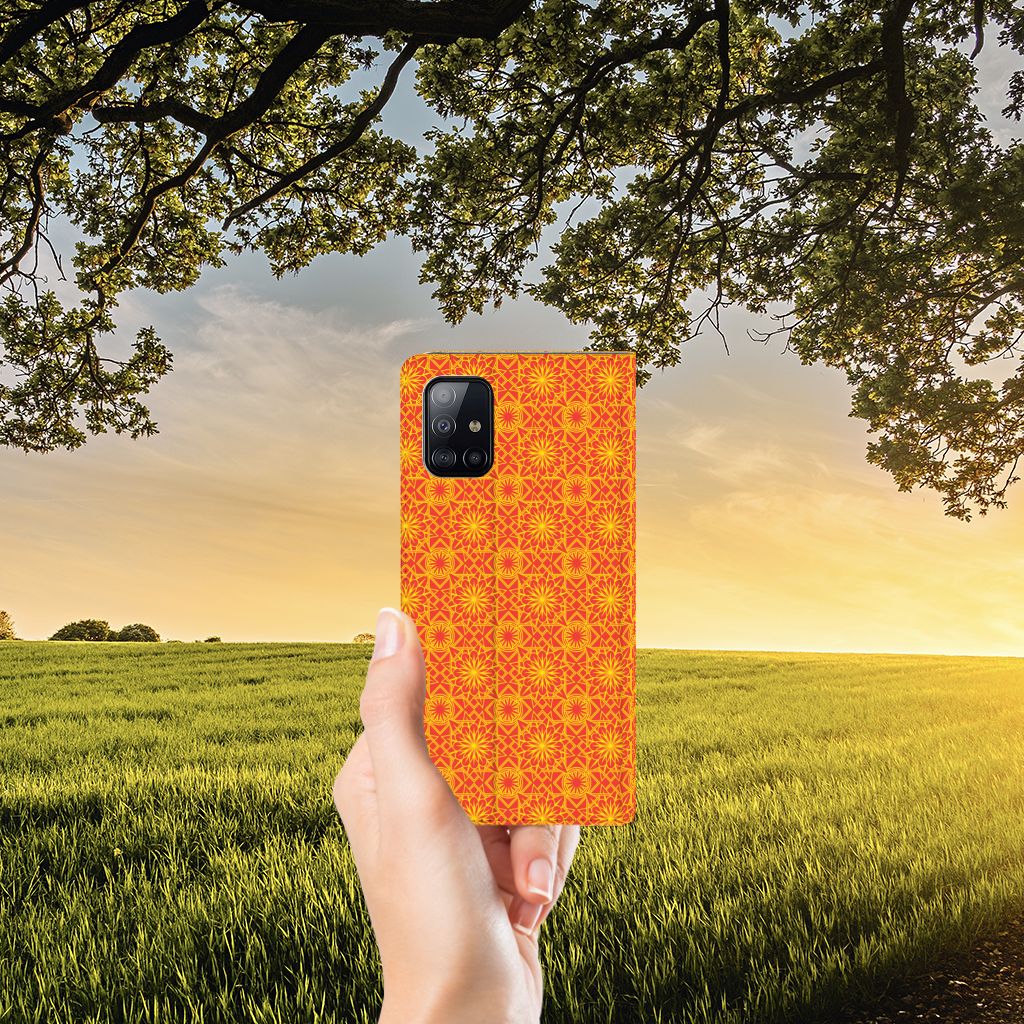 Batikken is een super oude kunstvorm. Met deze methode wordt een geweven stof met verf gedecoreerd. Er zijn stoffen gevonden in het Midden-Oosten en Azië van meer dan tweeduizend jaar oud. Wie had kunnen bedenken dat we zo’n mooie batik-print duizenden jaren later zelfs op telefoonhoesjes zouden terugvinden? Dit Hoesje met Magneet in voor je Samsung Galaxy A71 heeft een mooie oranje kleur en een prachtig symmetrisch patroon. Vanwege de felle kleurtjes is dit hoesje onwijs vrolijk. Het hoesje heeft binnenin één vakje voor een pasje en een magnetische sluiting aan de binnenkant. Verder heeft de batik orange-hoes een houder van TPU. Het leuke van een standcase is dat je hem eenvoudig neer kunt zetten. Zo heb je je handen vrij als je bijvoorbeeld een video wilt kijken op je smartphone.