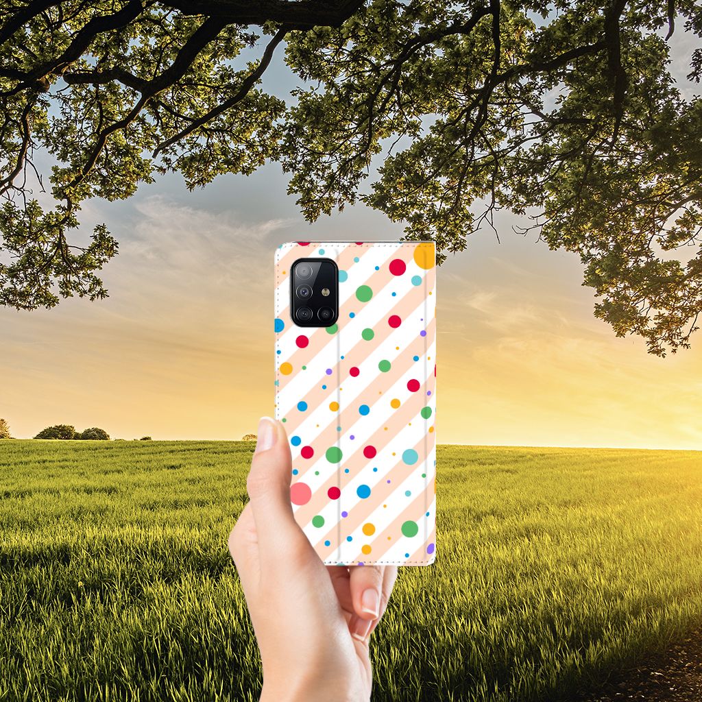 Een Samsung Galaxy A71 Hoesje met Magneet met verschillende kleuren stippen is een schitterende bescherming van jouw smartphone. De stand case met het design Dots in alle kleuren van de regenboog komt voor jou als geroepen. Maak je geen gebruik van dit zeer mooie hoesje, dan kan het met jouw smartphone een beetje beroerd aflopen. Dit mooie stand hoesje met verschillende kleuren stippen zorgt voor een volledige bescherming van je smartphone en wordt aan alle zijden bedrukt. Dankzij de speciale standaard kun je rustig achteroverleunend filmpjes bekijken terwijl je je handen vrij hebt. Verder is de houder aan de binnenzijde van TPU. Jouw telefoon is dus zeer goed opgeborgen en kan geen kant op. Met een hoesje met stippen in verschillende kleuren op alle zijden blijft jouw telefoon volledig in tact. Heb je liever een stand case met stippen in andere opvallende kleuren? Ontwerp dan zelf case met je eigen foto’s en teksten!