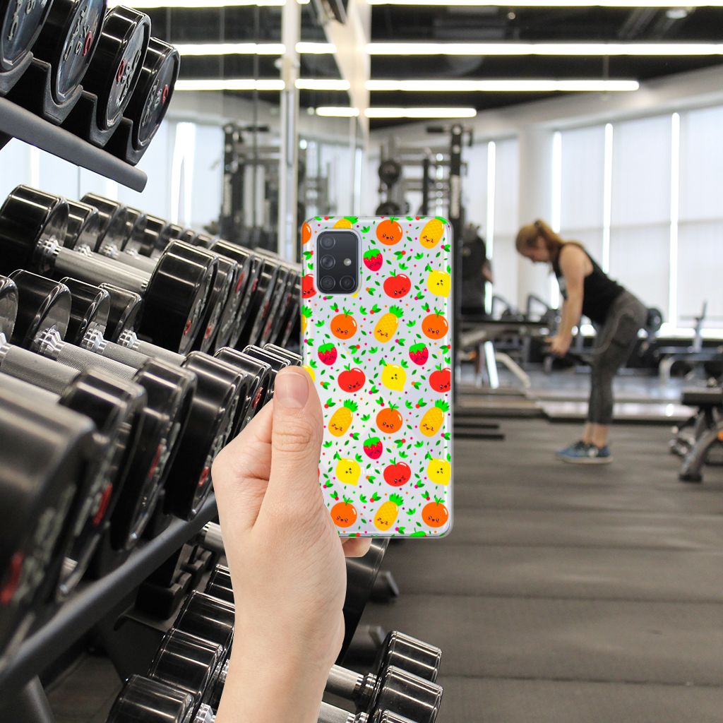 Een fris, fruitig en vrolijk hoesje, deze case met afbeeldingen van aardbeien, ananassen, appels, sinaasappels en citroenen. Minstens twee stuks fruit per dag wordt aanbevolen als dagelijkse hoeveelheid voor de mens. Dit verkleint de kans op allerlei ziekten. Dus met het aantal stukken fruit op de Samsung Galaxy A71 Siliconen Case zou je wel een maandje zoet moeten zijn. Met het hoesje zelf kun je je hele leven doen, dit is namelijk niet stuk te krijgen. Dit komt door het sterke en flexibele materiaal waarvan het gemaakt is. De vrolijk stemmende case het desing Fruits maakt jouw telefoon dus zeer duurzaam. Zorg ervoor dat jouw smartphone gezond blijft en kies voor dit hoesje met frivool fruit. Een tpu case met fruit wordt alleen aan de bovenkant bedrukt en is zeer flexibel. De randen van het hoesje blijven transparant en worden niet bedrukt met het fruit.