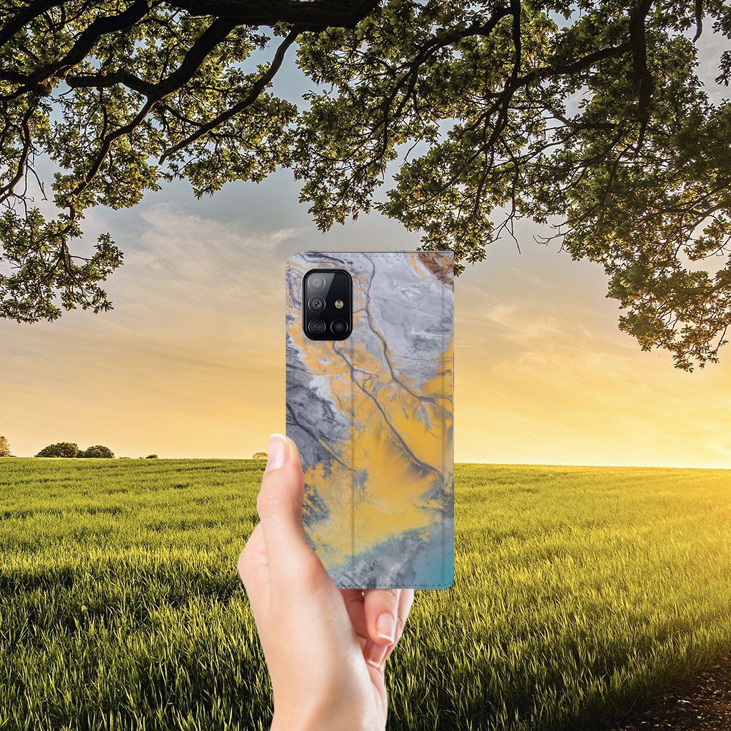 Deze Samsung Galaxy A71 Standcase met Marble Blue Gold is het waard om een blokje voor om te fietsen. Dit is echter helemaal niet nodig. Als je het hoesje met marmer blauw met goud nu bestelt heb je het supersnel in huis. Je kunt er bij wijze van spreken voor de brievenbus op blijven wachten. Je hebt diverse marmersoorten in veel verschillende kleuren. We hebben enkele mooie kleuren op design hoesjes gezet, zoals in dit geval marmer blauw met goud. Het marmer wordt bedrukt op alle zijden van de stand case, die beschikt over een vakje voor pasjes of briefgeld en een magnetische sluiting aan de binnenzijde. Verder heeft de case met marmer blauw met goud een houder van TPU. De rijkheid aan kleuren en variaties in afwerking is een fraaie eigenschap van marmer. Dit stand hoesje met marmer blauw met goud heeft ook veel schitterende eigenschappen en is de ideale bescherming voor jouw smartphone.