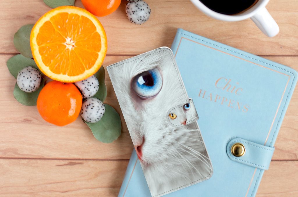 Witte katten zijn erg bijzonder en dat is precies de reden dat wij deze op prominente wijze op dit design hoesje hebben geplaatst. Maar deze witte kat is extra speciaal, doordat de ogen twee verschillende kleuren hebben: blauw en vurig rood. Hiermee heb jij als uniek mens ook een unieke bookcase. Ook de manier waarop dit telefoonhoesje voor de Samsung Galaxy A71 is bedrukt, is bijzonder. Je ziet namelijk een kleinere versie van dezelfde kat terug op het lipje. Hierdoor zie je de speciale witte kat twee keer terugkomen op jouw hoesje. Omdat je waarschijnlijk een dierenliefhebber bent als je dit Telefoonhoesje met Pasjes uitkiest, is dit ook een erg duurzaam hoesje. Het hoesje wordt aan alle kanten met duurzame inkt bedrukt.