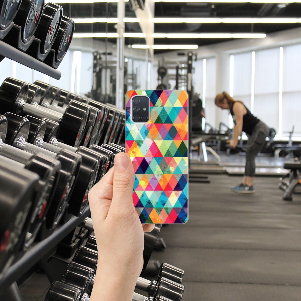 Van dit geruite design hoesje moet je een beetje houden. Maar als je het eenmaal in bezit hebt, ben je waarschijnlijk binnen no time verkocht. Het design heeft ruitjes in alle kleuren van de regenboog en door de grijze achtergrond kan het hoesje enigszins druk overkomen. Maar tegelijkertijd is dit de kracht van het hoesje. Met dit design hoesje Geruit zal je namelijk heel erg opvallen. Dit is voor veel vooral jonge smartphone gebruikers een belangrijk voordeel. Deze geruite print staat op een Samsung Galaxy A71 TPU bumper. Dit zeer flexibele smartphone hoesje heeft alle nodige uitsparingen en past altijd in je broekzak. De case is aan de bovenkant bedrukt, de randen blijven transparant.