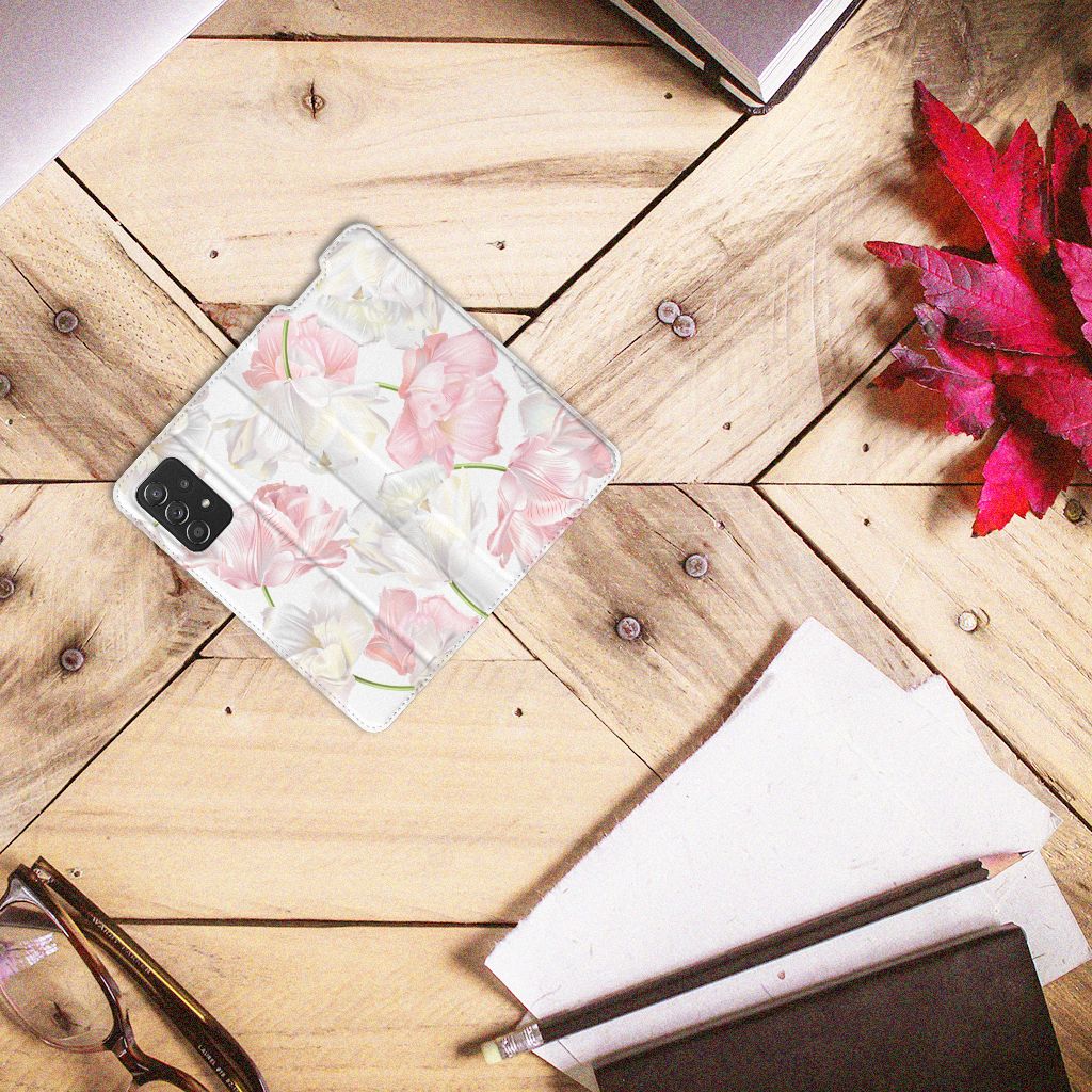 Een bosje bloemen doet een mens (en zijn smartphone) goed. De witte en roze bloemen op dit Samsung Galaxy A72 (5G/4G) Smart Cover geven jouw smartphone een zeer mooie uitstraling. Je wordt er ook meteen een stuk rustiger van als je aan het appen of aan het bellen bent. Valt dan je telefoon op de grond, dan zal er dankzij de stand case met het design Lovely Flowers ontstaan. Onze stand cases met roze en witte bloemen zien er zeer prettig uit en zijn heel praktisch, wat blijkt uit onder meer het vakje aan de binnenkant en de handige standaard waarmee je de smartphone rechtop op tafel neer kunt zetten. De roze en witte bloemen passen goed op alle zijden van de case. Op deze stand case van leer en TPU (houder aan de binnenkant) kun je trouwens ook je eigen bloemige ontwerp zetten. In een paar simpele stappen maak je zelf een stand hoesje met daarop jouw mooiste bloemen.